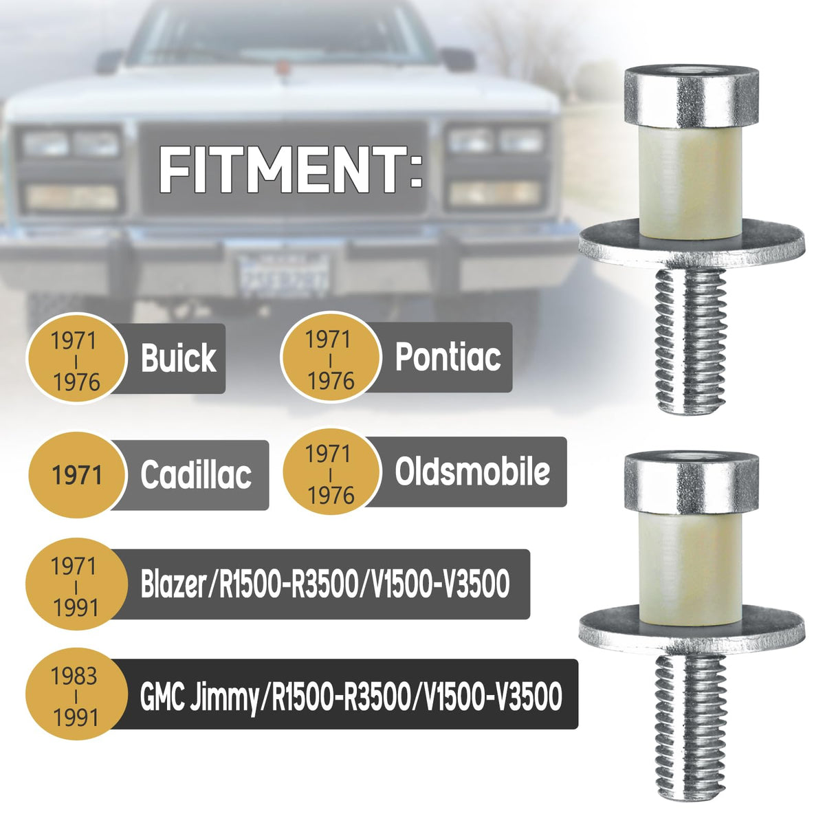 Fitment: 1983-1991 Gmc Jimmyr1500-R3500V1500-V3500 1971-1991 Blazerr1500-R3500V1500-V3500 1971-1976 Buick 1971 Cadillac 1971-1976 Oldsmobile 1971-1976 Pontiac Please Contact Us Or Leave Q&As To Knowmore Detail About Adaptability Installation Tips: The Original Nut Inside The Pillar Isntheld By Anything So When You Remove The Bolt, That Part Will Fall Into Therocker Panel, A Magnetic Pick-Up Tool Or A Helper With Small Hands Can Be Veryhelpful In The Event Of A Dropped Nut