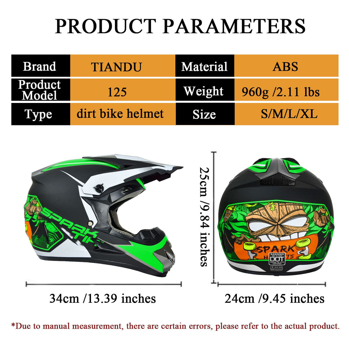 Product Name:Motocross helmet Housing material: ABS Weight: 960g (2.11 lbs) Appearance: painted pattern Accessories: gloves, goggles, masks Inner lining & Cheek pads is removable and washable, The extremely soft, sweat absorbing inner pad keeps you cool during the ride
