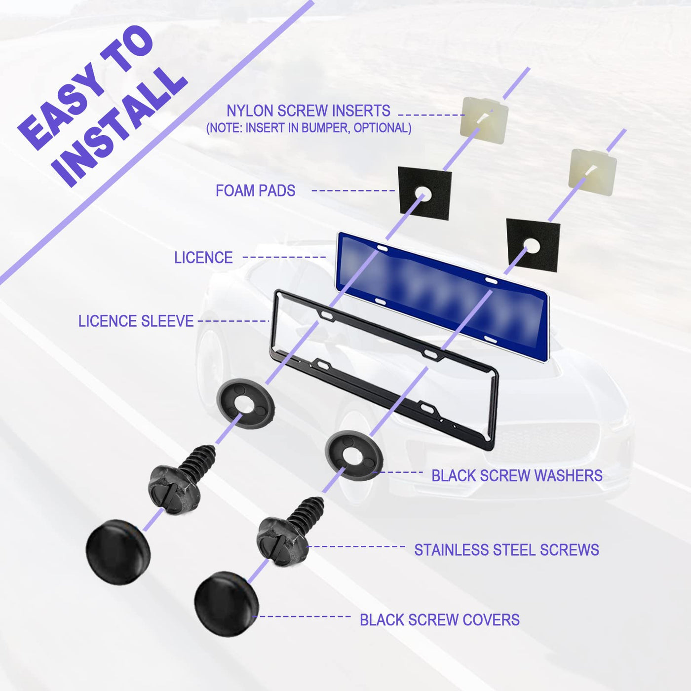 Q: What comes in the package of these license plate screws?A: The package includes 4 premium stainless steel screws, 4 foam pads, 4 screw washers, 4 screw covers, and 4 nylon screw inserts for a complete installation.