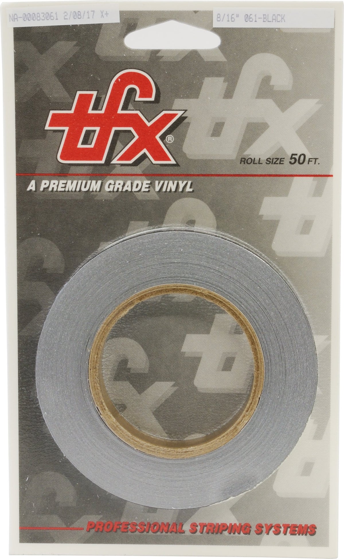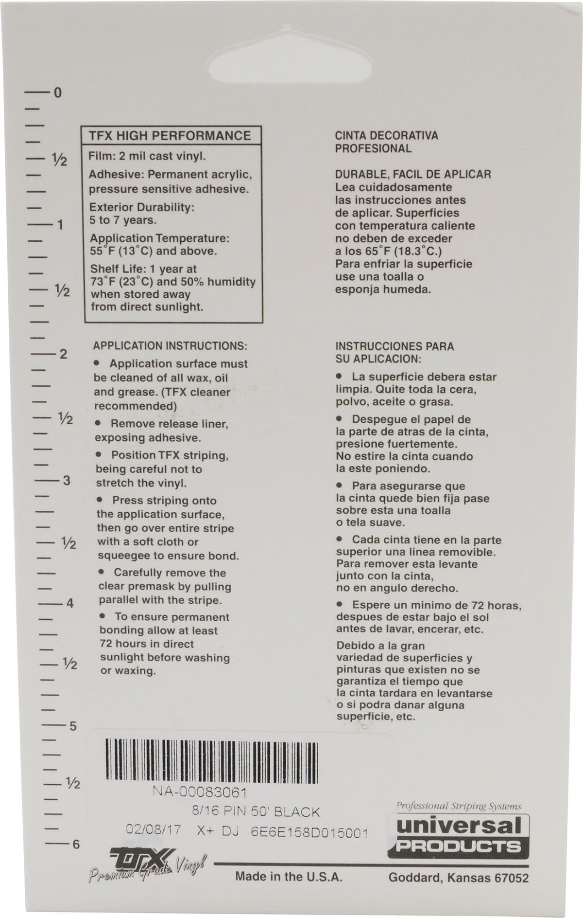 • Q: What are the dimensions of the Universal TFX 00083098 pinstripe tape? A: The tape measures eight sixteenths of an inch overall width and comes in a fifty-foot continuous roll. This size allows for extensive customization on vehicles.