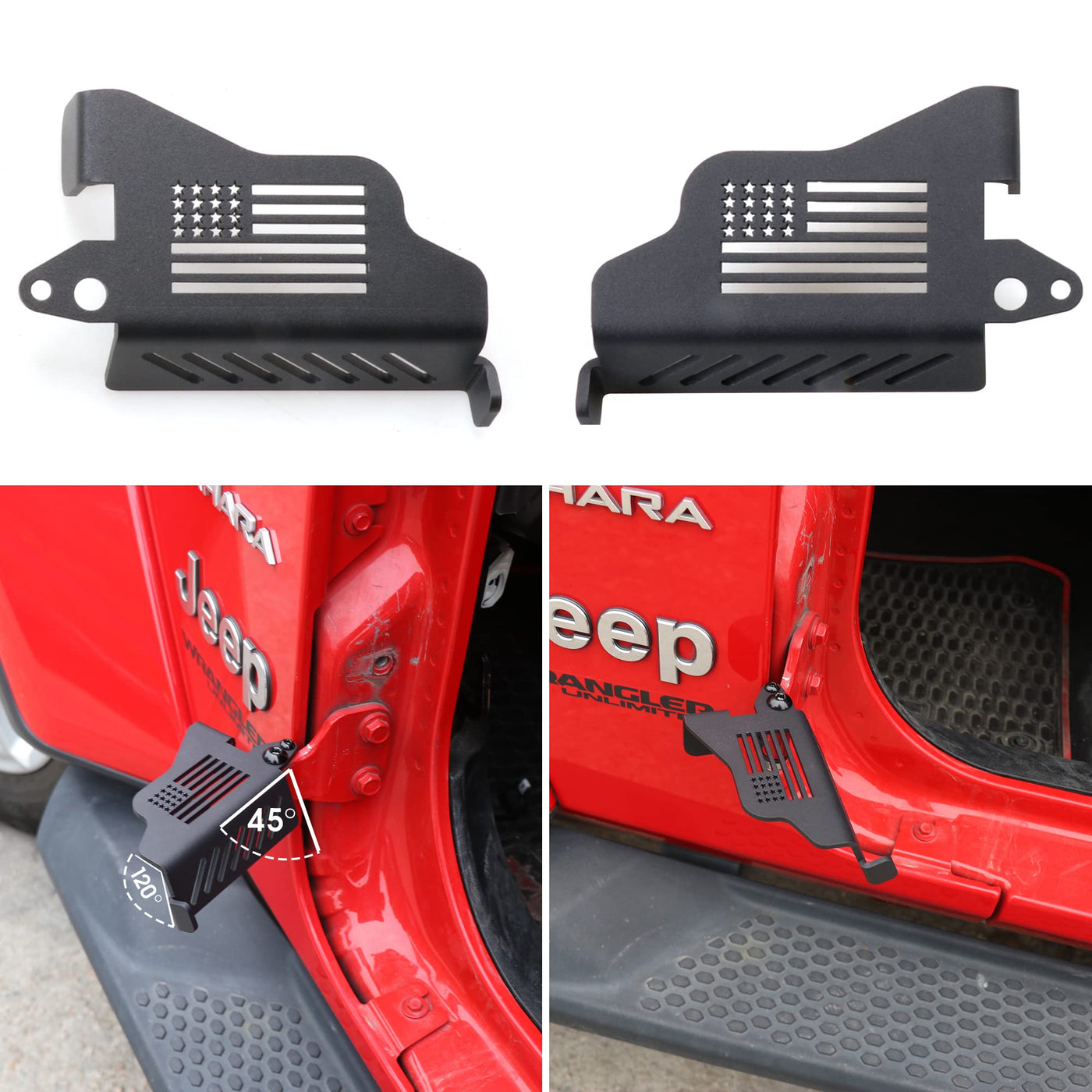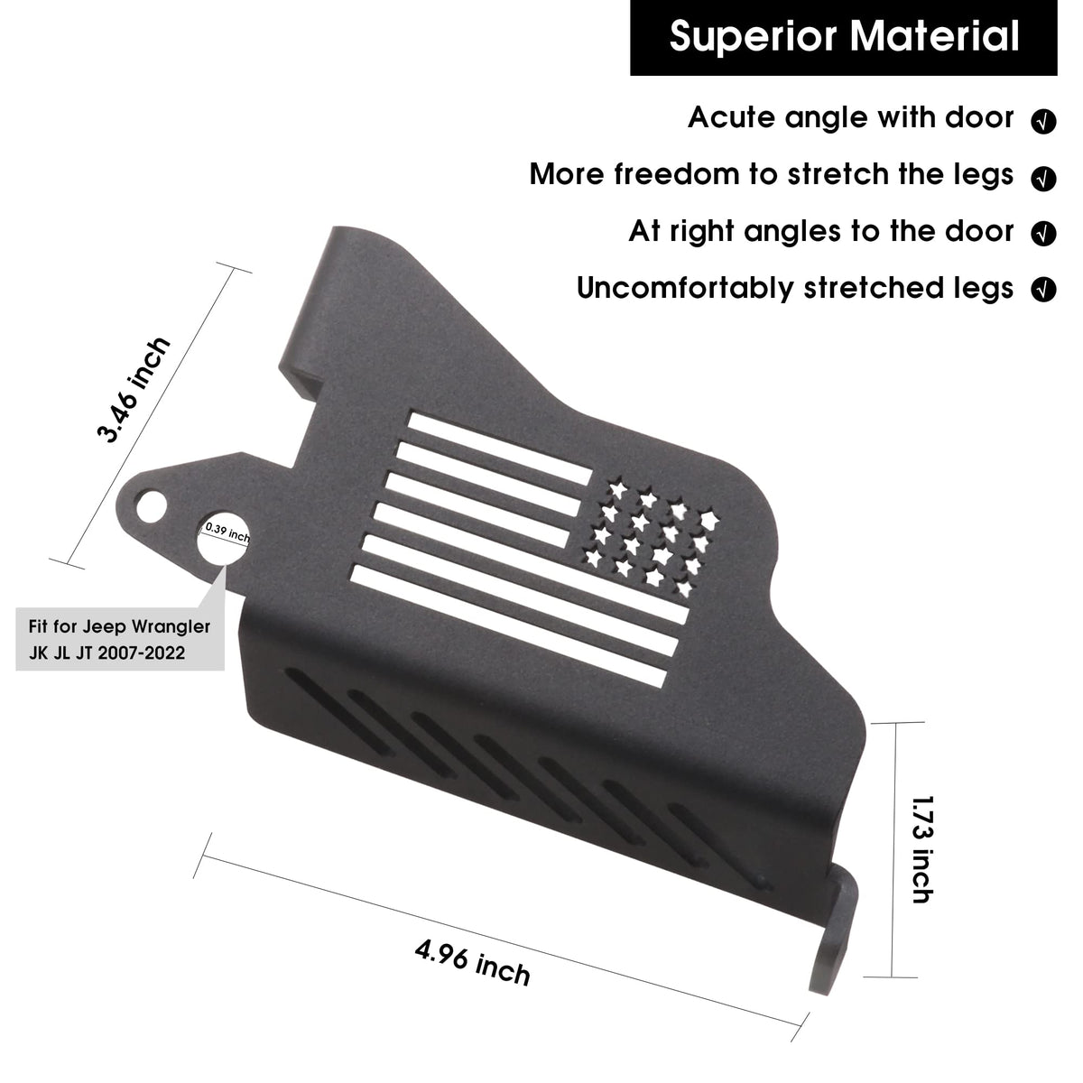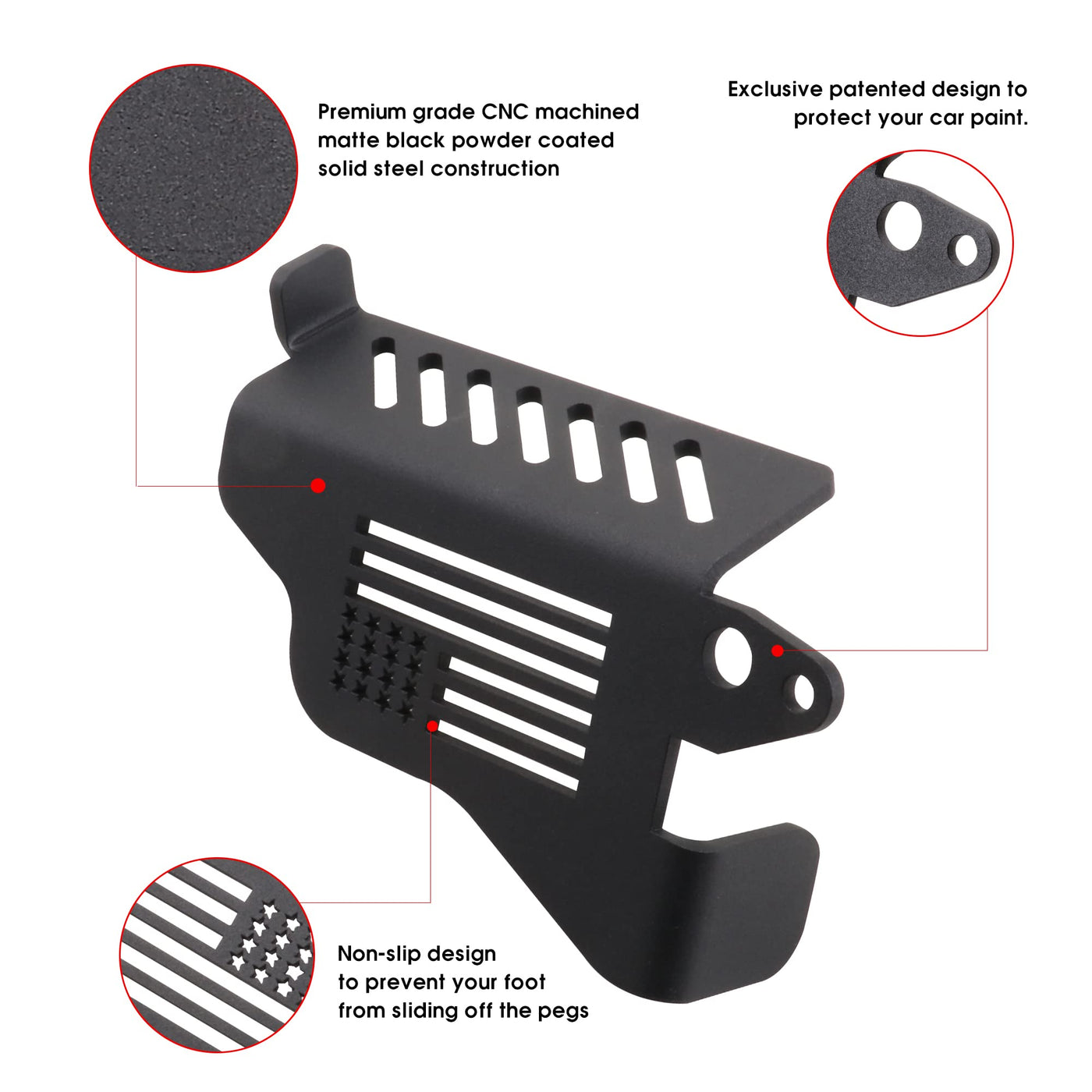 Upgrade Door Hinge Foot Pegs for Jeep Wrangler, Sukemichi Black Steel Exterior Foot Peg Rest Pedals for 2007-2024 Jeep Wrangler JK JKU JL JLU Gladiator JT, 1 Pair Item Description Fitment: Compatible with 2007 2008 2009 2010 2011 2012 2013 2014 2015 2016 2017 2018 Jeep Wrangler JK JKU Unlimited Sport Rubicon Sahara accessories Compatible with 2018 2019 2020 2021 2022 2023 2024 Jeep Wrangler JL JLU accessories Compatible with 2020 2021 2022 2023 2024 Jeep Gladiator JT accessories Note: Please check whether this item can fit on your car before (Not for TJ) Condition: 100% Brand New Material: Stainless steel structure with matte black powder coat finish Color: Black Pattern: Flag / Star Package included: 2 x For Jeep foot pegs Features: The contact area of the foot is increased, and the sitting position is more comfortable.. For Jeep Wrangler foot pegs Inclined design allows you to stretch your legs more freely Zero-touch with the car paint surface to protect the car paint from damage. It gave your feet a ''landing spot'' this summer.