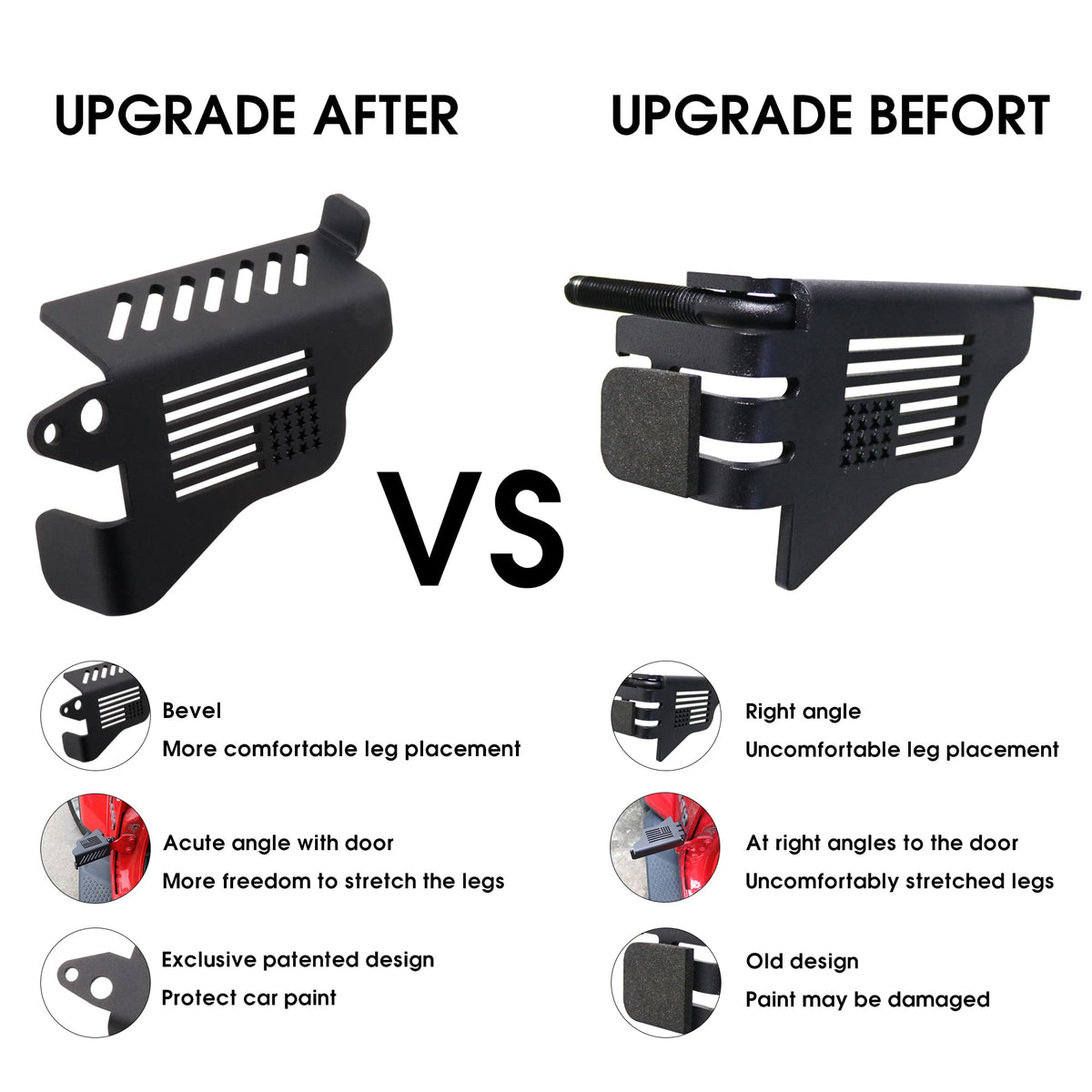 Q: What are the benefits of using these foot pegs?A: The foot pegs provide a larger contact area for your feet, enhancing comfort while driving. Their inclined design allows for greater leg stretching, and they are designed to avoid contact with the car's paint, preventing any potential damage.
