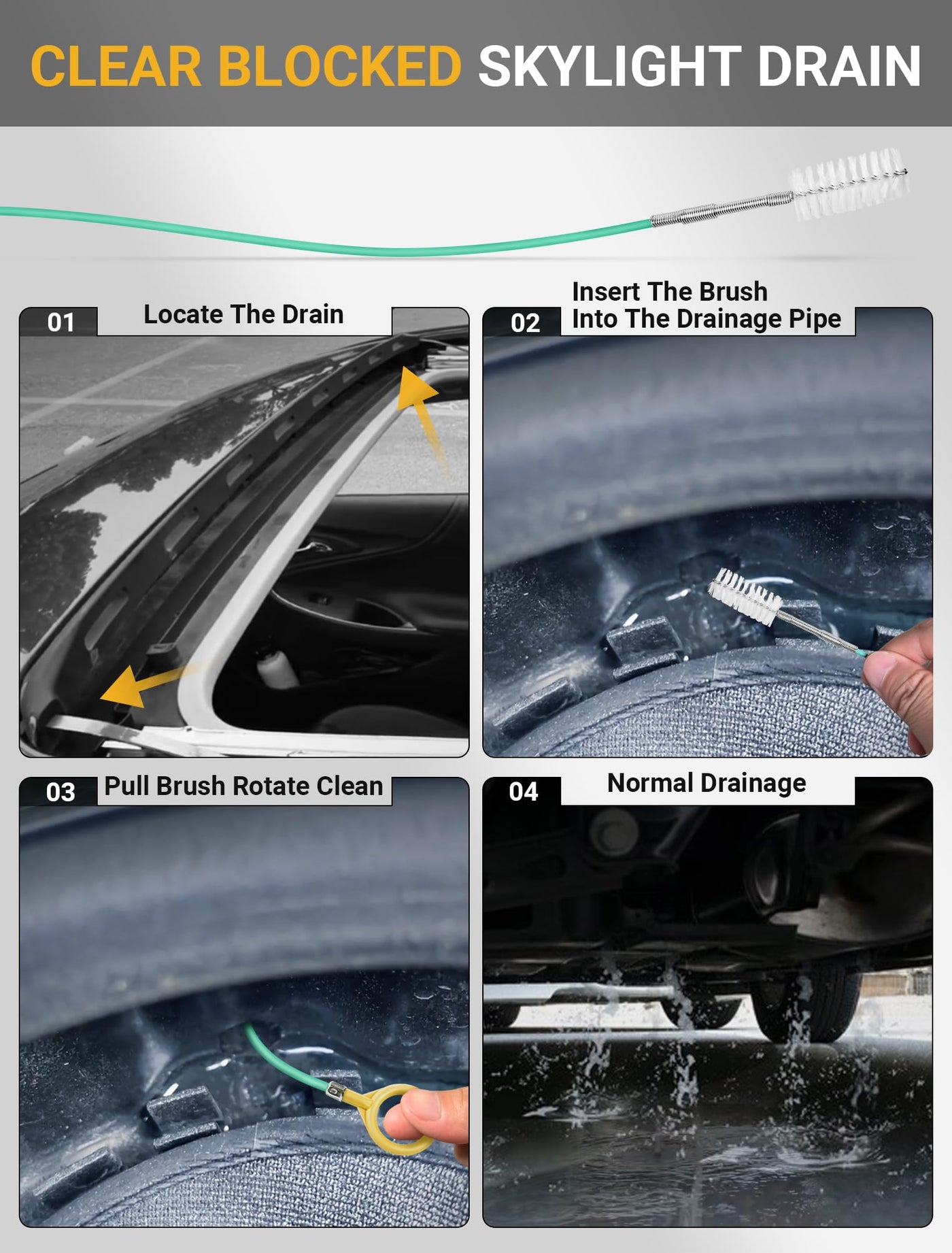 Upgraded Auto Sunroof Drain Cleaning Tool, 78 Inch Flexible Drain Brush Long Pipe Cleaners For Car, Tube Cleaning Brush Slim Drain Dredging Tool Perfect For Car Sunroof, Windshield Wiper Drain Hole ?Steel Wire With Pvc Pipe?This Upgraded Drain Brush With High Toughness, No Damage And Scratch To The Soft Rubber Sunroof Pipe. Works Safer And Faster On Dredging Obstruction In Various Of Thin Long Pipelines. ?120 Inches Longer Drain Brush?Upgrade Lengthened To 120 Inches (300 Cm), Long Enough To Clean Narrow Pipes That Cannot Be Reached By An Ordinary Cleaning Brush. As Well As Flexible Enough To Even Work With Curved Tubing. ?Nylon Rotating Bristles?One End Of This Drain Cleaning Brush Is The Tubular Shaped Brush, Well Made Of Nylon Rotating Bristles, Soft And Scratch Free. Helps You Gently Remove The Leaves, Dirt, Cobwebs And Debris, Can Be Reused For A Long Term. ?Practical Hand Ring Design?The Other End Of This Hose Pipe Brush Is A Hand Ring, Designed For Easy Extraction. You Don'T Need To Worry About The Pipe Cleaner Brush Falling Into The Hose And Not Being Taken Out, More Convenient For Holding And Energizing. ?Wide Application?This Flexible Drain Brush Is Perfect For Car Sunroof, Auto Wiper, Fuel Tank Drain Hole, Car Door Drain Hole, Skylight Drain Pipe And So On. Also Ideal For Refrigerator Drain Cleaning, Fish Tanks Cleaning, Hose Or Glass Tubes Cleaning, Water Pump Accessories Cleaning, Filter Systems Cleaning, Etc. Perfect Solution On Dripping And Clogging Problems.