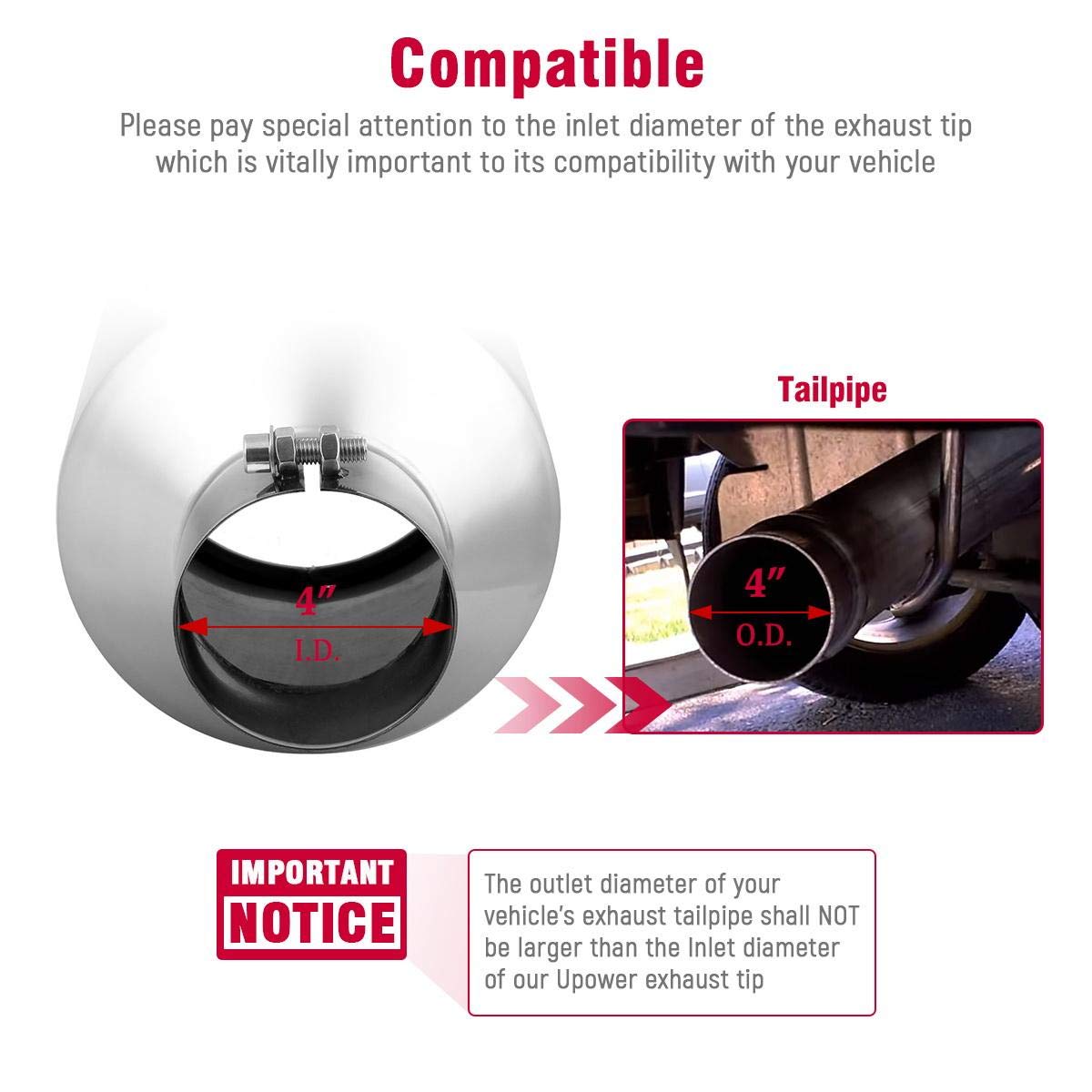 1. Fits: Universal Exhaust Tips, Suit 4 Inch Inlet Pipe 2. Exhaust Tip Features: *Size: 4' Inlet - 6' Outlet - 15' Long *45 Degree Single Angled Cut - Rolled Edge Design *Installation: Bolt On, Easy Installation *High Quality And 100% Brand New *Material: Stainless Steel With Very Strong Anti-Corrosive, Never Rusty.