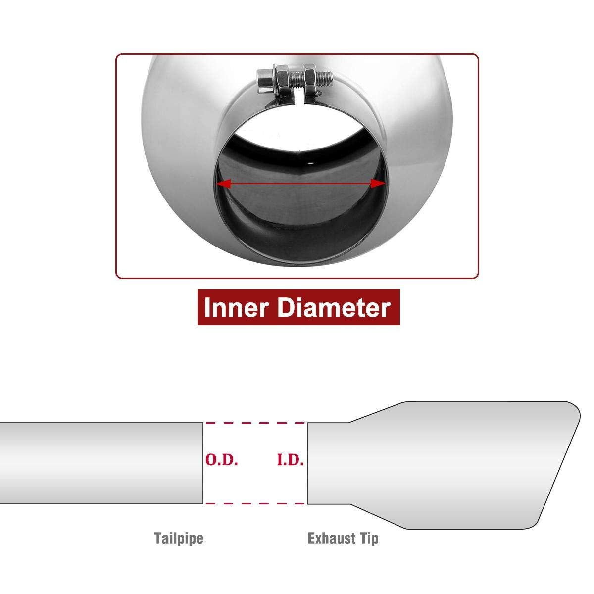 3. Exhaust Tip Description: *Features Corrosion Resistance To Alkali Solution And Most Organic And Inorganic Acids. *Repeated Polishing Processing, Bright As A Mirror, Highlighting The Noble Quality. *Perfectly Decorate The Exhaust Pipe Of Your Car. 4. Package Included: 1*Stainless Steel Exhaust Tip