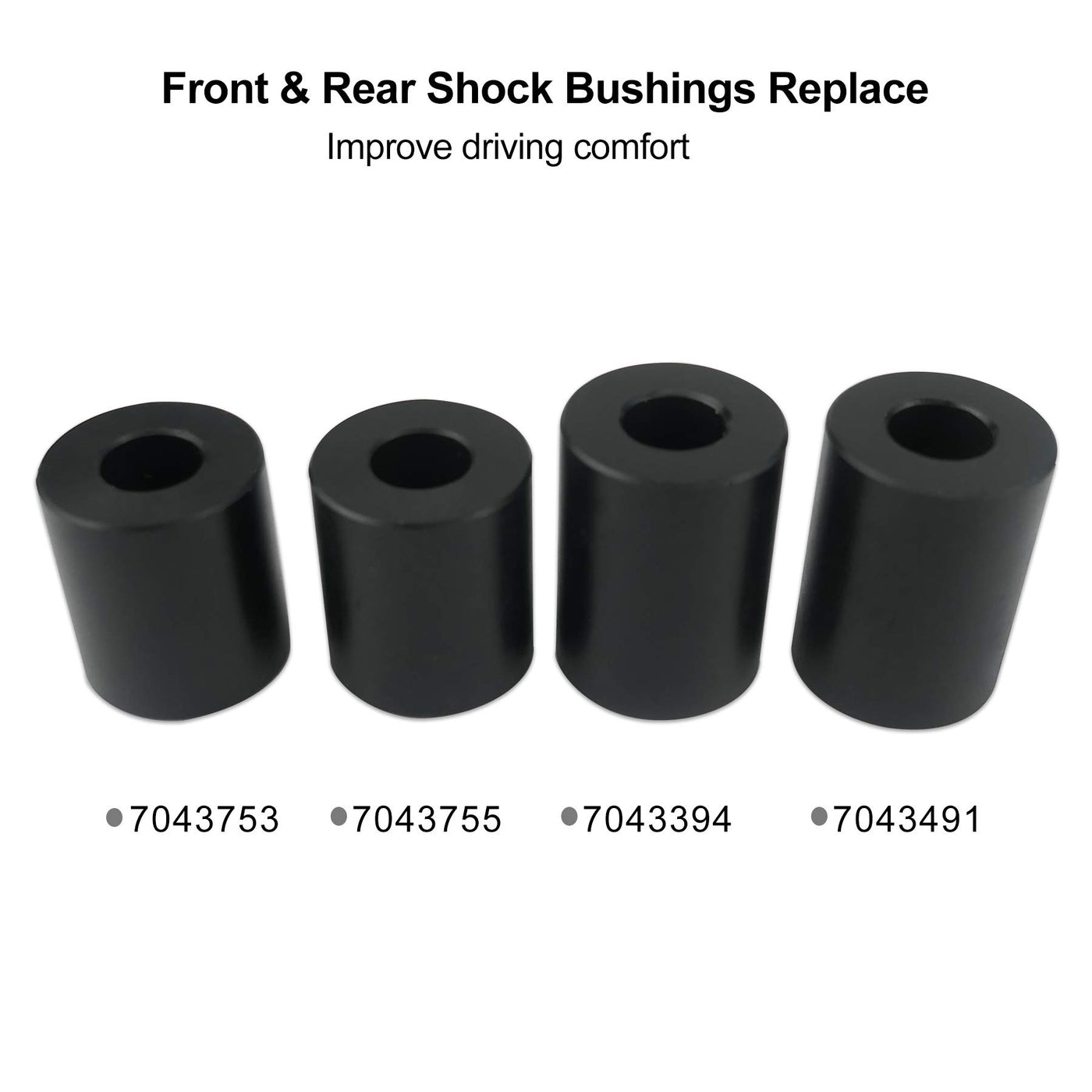 Q: What are the replacement part numbers for these bushings?A: The replacement part numbers for these front and rear shock bushings are 7041770, 7041959, 7041454, and 7043100. Ensure these match your current bushings for compatibility.