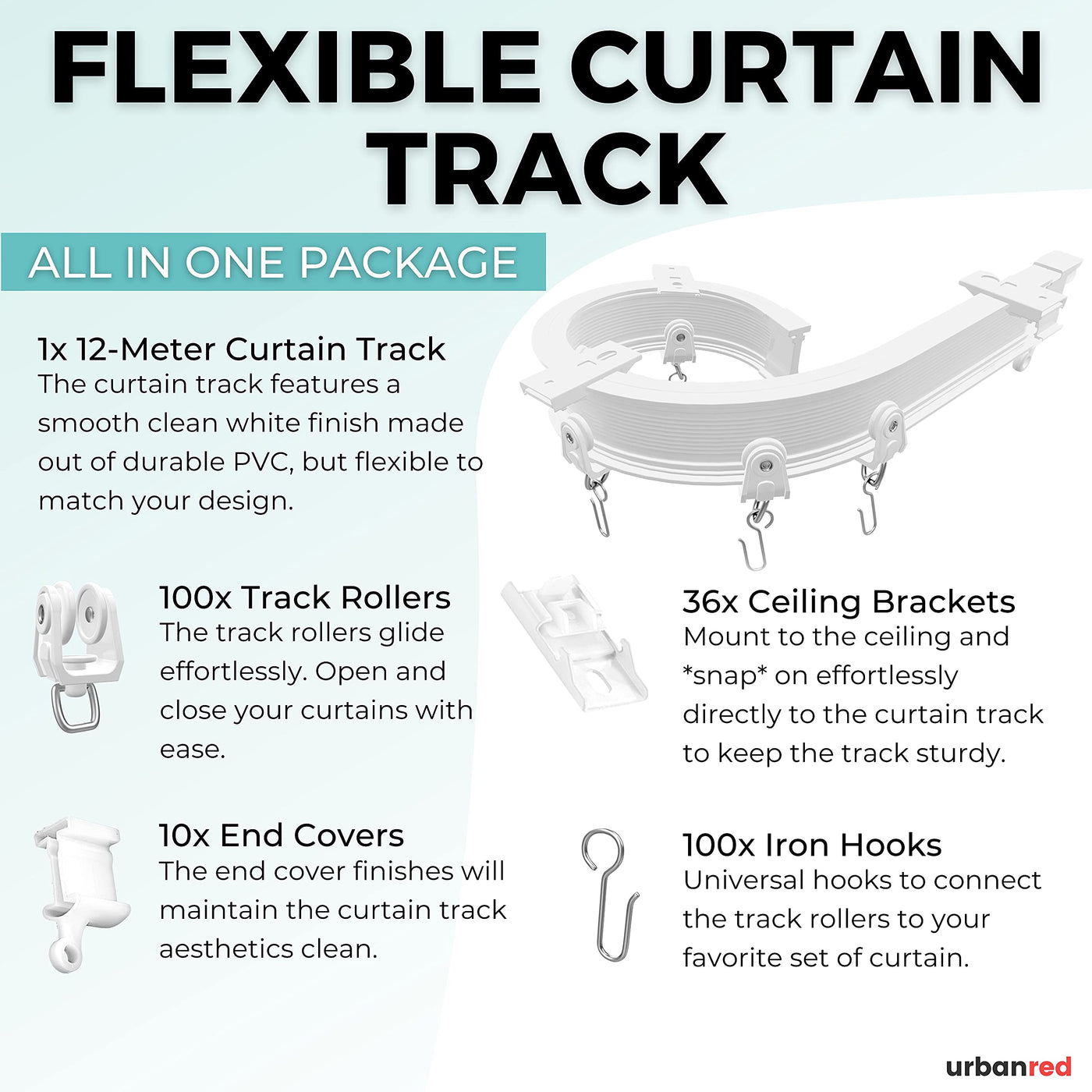 Q: What materials are used in the curtain track system?A: The UrbanRed curtain track system is made of durable PVC plastic, ensuring flexibility while being strong enough to resist cracking or breaking. It also includes 100 track rollers and universal sturdy iron hooks.
