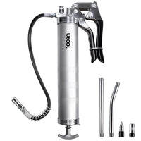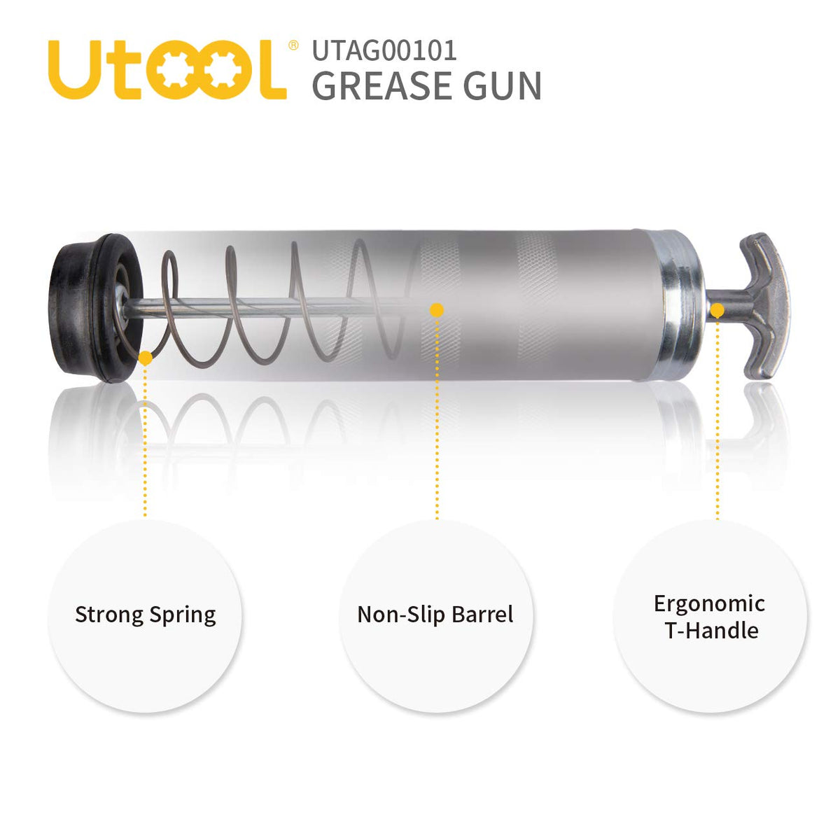 The Utool Grease Gun Features A Short Stroke For Tight Work Areas, And The Base Is Removable For Convenience. Non-Slip Knurling On The Barrel Provides Added Grip In Slippery Situations. Item Specification: Color: Argent Cartridge: Standard (14 Oz) Maximum Pressure: 8000 Psi Barrel: Fer. Weight: 3.09 Lb Package Included: 1 X Grease Gun 1 X 18 Inch Spring Flex Hose 1 X Extension Bend Pipe 1 X Extension Straight Pipe 1 X Sharp Type Nozzle 1 X Normal Coupler 1 X Reinforced Coupler