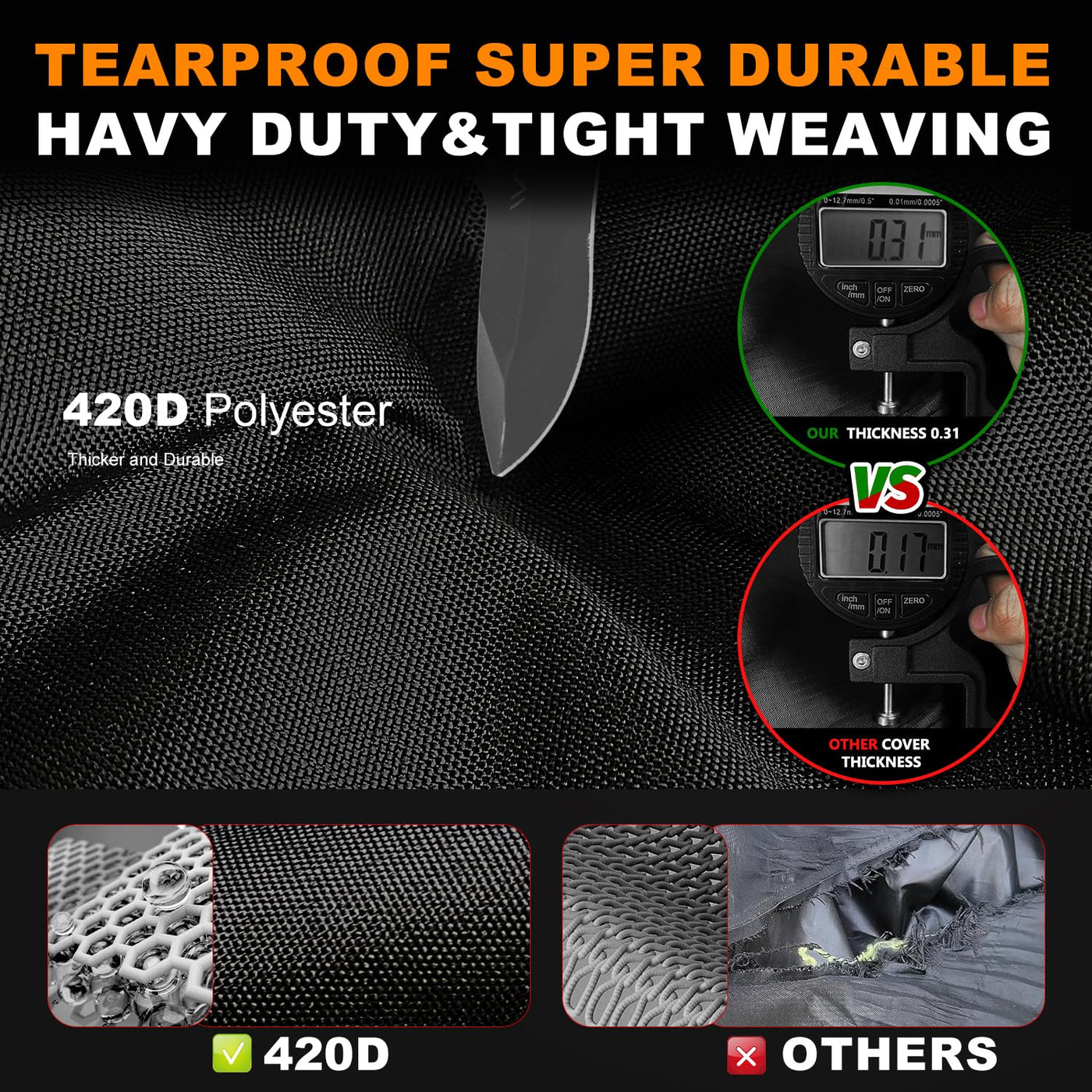 *****About Size***** The size of your utv is less than 2-4 inch than the cover, it is most suitable,so measures size before you pruchase please,Thank You! ClawsCover founder Evan is a motorcycle rider,we have focus on produce outdoor covers,we have motorcycle cover/ATV cover /UTV cover /bike cover /mobility scooter cover/PingPong table cover/outdoor sofa cover, the brand name(ClawsCover) means to can not broken by the wolf's claws,the cover should be durable & waterproof & windproof & sun protection & dust protection and more,we hope all of the covers can solve your needs,save your money and being happy own it. if have any quality defects and wrong size,24 hours contact us for free,we'll give a satisfy answer for you! Specifications:Brand:ClawsCover Size:L x H x W -170x70x80 inches Material: 420D oxford cloth ,Reflective strap :2 straps ,windproof strap:2 adjustable windproof straps, Vents quantity:2 vents, Elastic band:all elastic band at the bottom of cover,other cover just have a part elastic band, Washing:hand wash or washing machine, Package size:13.7x11.8 inches,Features:Heavy duty,Waterproof, Windproof ,Snowproof, Dustproof,Tearproof,UV Protection, Fadeless,Package Inclued: 1 * ClawsCover UTV Cover 1 * Easy To Carry Storage Bag*****Very Important*****1.When use the bike cover please tight the windproof straps avoild to being blown into the water.2.When you storage the cover, keep it dry for longer life. 3.Any cover with vents maybe enter a little water when it is blowing strong winds, please paying particular attention to this situation.4.If the size don't fit your car,you can return it,but don't damage the cover and storage bag,thank you.