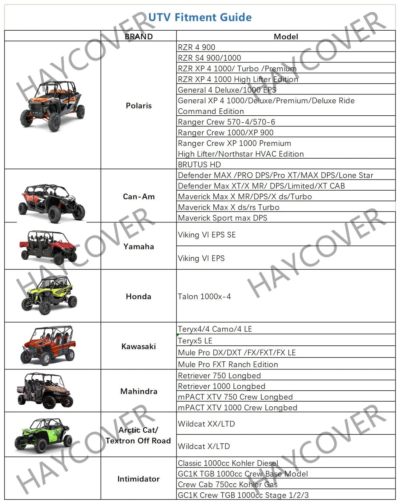 HAYCOVER COVER---OFFER A VARIETY OF OUTDOOR & INDOOR COVER,SUCH AS:UTV COVER, CAR COVER,ATV COVER, GOLF CART COVER,MOTORCYCLE COVER,,TABLE COVER,BOAT COVER ,MOBILITY SCOOTER COVER,TIRE COVER AND SO ON There is nothing more impatient than cleaning the UTV vehicle every time after you using it. With this UTV cover, your UTV will won't get aged soon . Just remove the side by side utv cover and you can start your race. Features: DURABLE & ATTRACTIVE - High Performance Cover for you STURDY - Made With Denier Oxford Cloth Materials for Ourdoor & Indoor Use in Summer and Winter. SUPERIOR WATERPROOFING & WIND SHELTER - Durable Material, Cover Vents, Elastic Hem, Buckles to keep your UTV Waterproof &Windproof. PROTECT YOUR INVESTMENT - Taped Seams, Front Mark, Night Reflective, Cover Vents, Strap & Buckles. Storage Bag - HAYCOVER Storage Bag, for easy storage when your cover is not in use. Package Included: 1xUTV Cover 1xDuffel Bag 2x Alternate Plastic Snaps 3x Bandage 3x Plastic Snaps in cover''