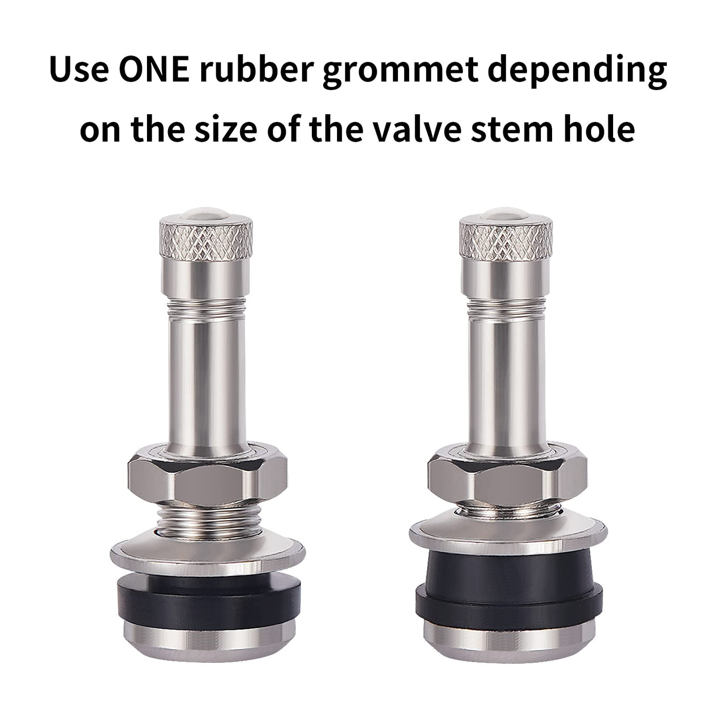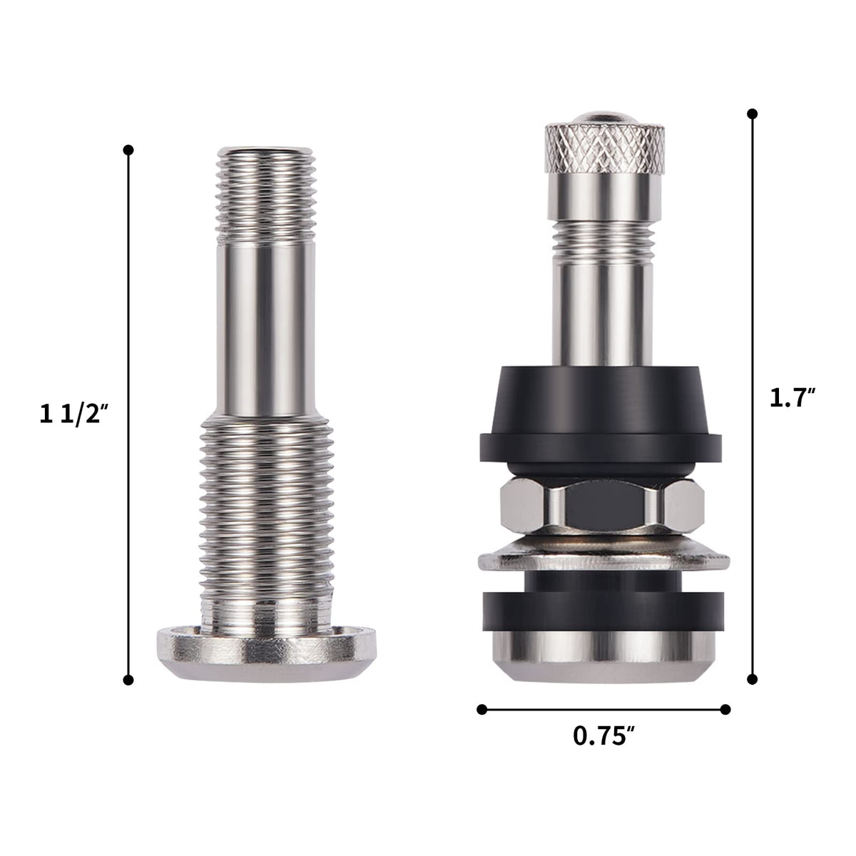 Model: Tr416 Color: Silver Quantity: 4 Pcs Tr416 Metal Valve Stems Material: Nickel Plated Brass, Epdm Rubber Effective Length: 1 12 Inch Complete Size: 17 L X 075 W Recommend: Before Placing An Order, You Have To Match The Valve Size To The Hole In And Thickness Of The Rim And Make Sure You Do Not Excede The Psi Rating Of The Valve How To Replace Valve Stem 1Identify Whether Or Not The Valve Stem To Be Replaced Has A Tpms These Valve Stems Will Not Fit The Wheel With Tpms 2Identify Whether The Valve Stem To Be Replaced Is A High Pressure Valve Stem 3Deflate The Tire 4Before Inserting The Valve Stem, You Can Lubricate It 5Push The Old Valve Stem Through The Rim And Remove The Valve Stem From The Wheel 6Choose Which One Of The Black Rubber Grommet You Need Insert The New Metal Valve Stem From Inside The Rim And Pull Through Until The Rubber Grommet Is Seated 7Seat The Tire And Inflate