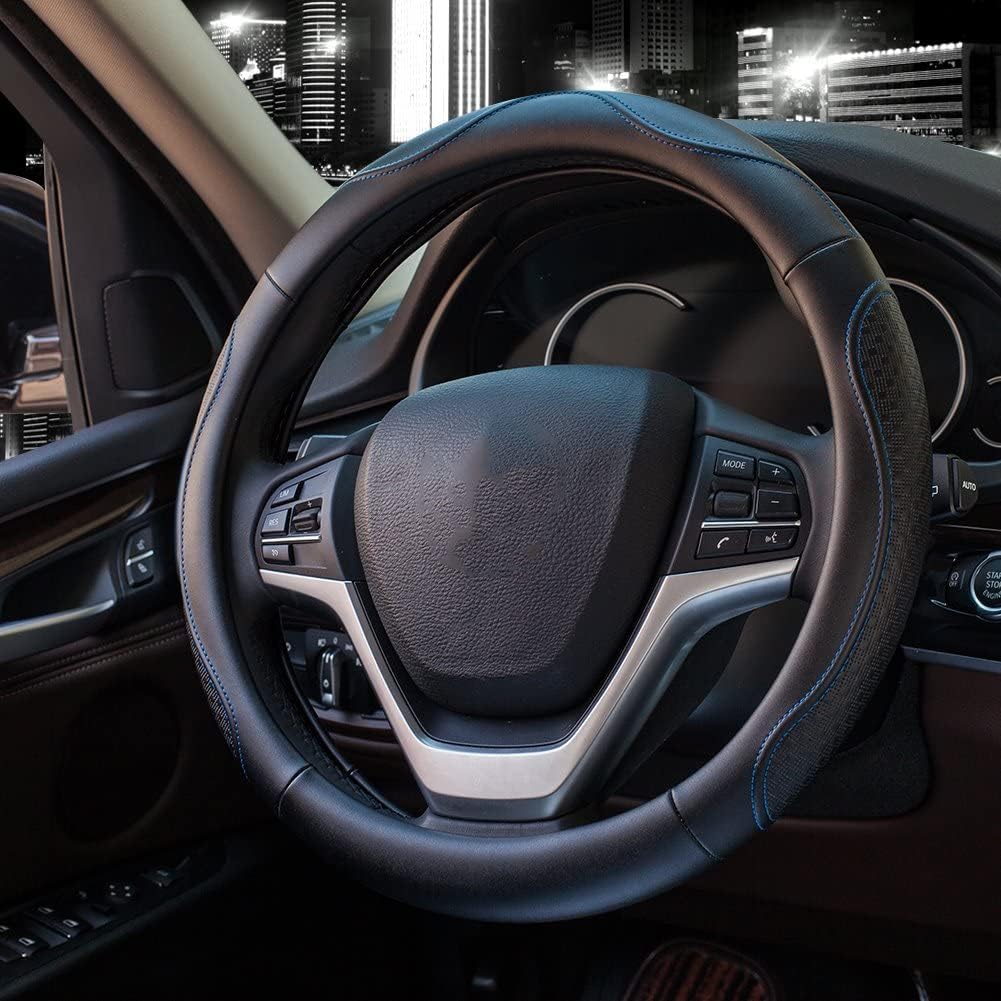 Valleycomfy Leather Steering Wheel Covers Universal 15.75 Inch -Breathable, Anti Slip & Odor Free (Black With Blue Lines,L(15''