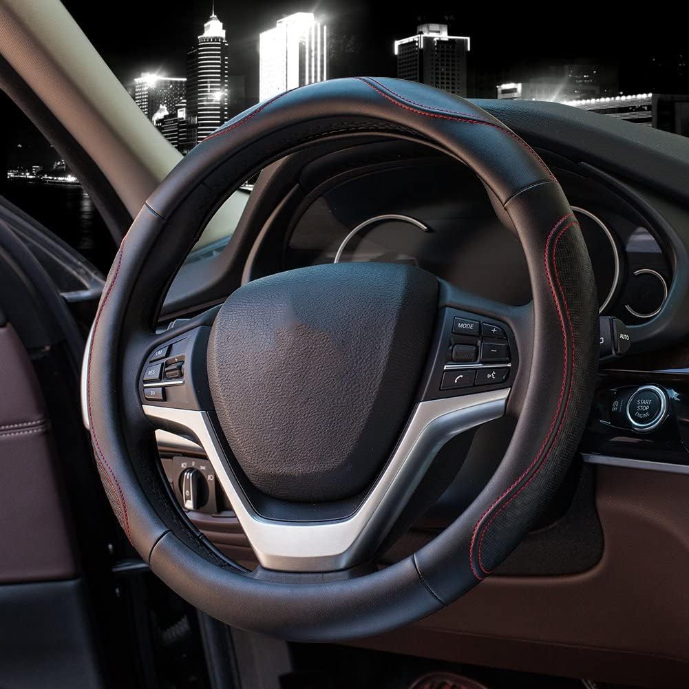 Valleycomfy Leather Steering Wheel Covers Universal 15.75 Inch -Breathable, Anti Slip & Odor Free (Black With Red Lines,L(15 1/2-16))