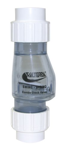 This Valterra 200-CU15 union check valve is made of clear schedule 40 PVC (polyvinyl chloride) for strength and resistance to corrosion and mild chemicals. Its EPDM (ethylene propylene diene monomer) seal resists degradation caused by water and oils, and the swing/spring construction of this valve makes it possible to install it in any position. It has a 1-1/2' slip connection at each end, which must be fastened with glue, a maximum pressure rating of 150 pounds per square inch (psi), and a spring tension of 1/2 lb. This check valve is suitable for use with landscape and irrigation, pool and spa, aquaculture, and general purpose applications.
