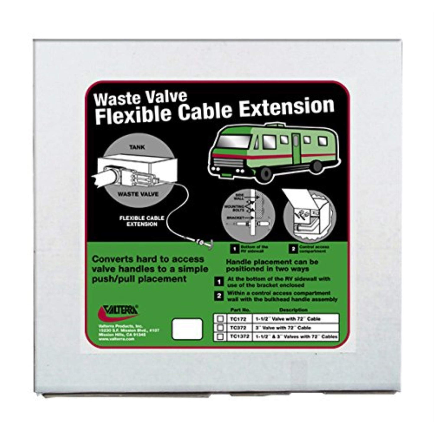 Valterra Products, Inc. Flexible Cable Kit with Valve converts hard to access valve handles to more convenient placement. Cable handles can be positioned at the bottom of an RV sidewall, or within a control access compartment with bulhead installation.
