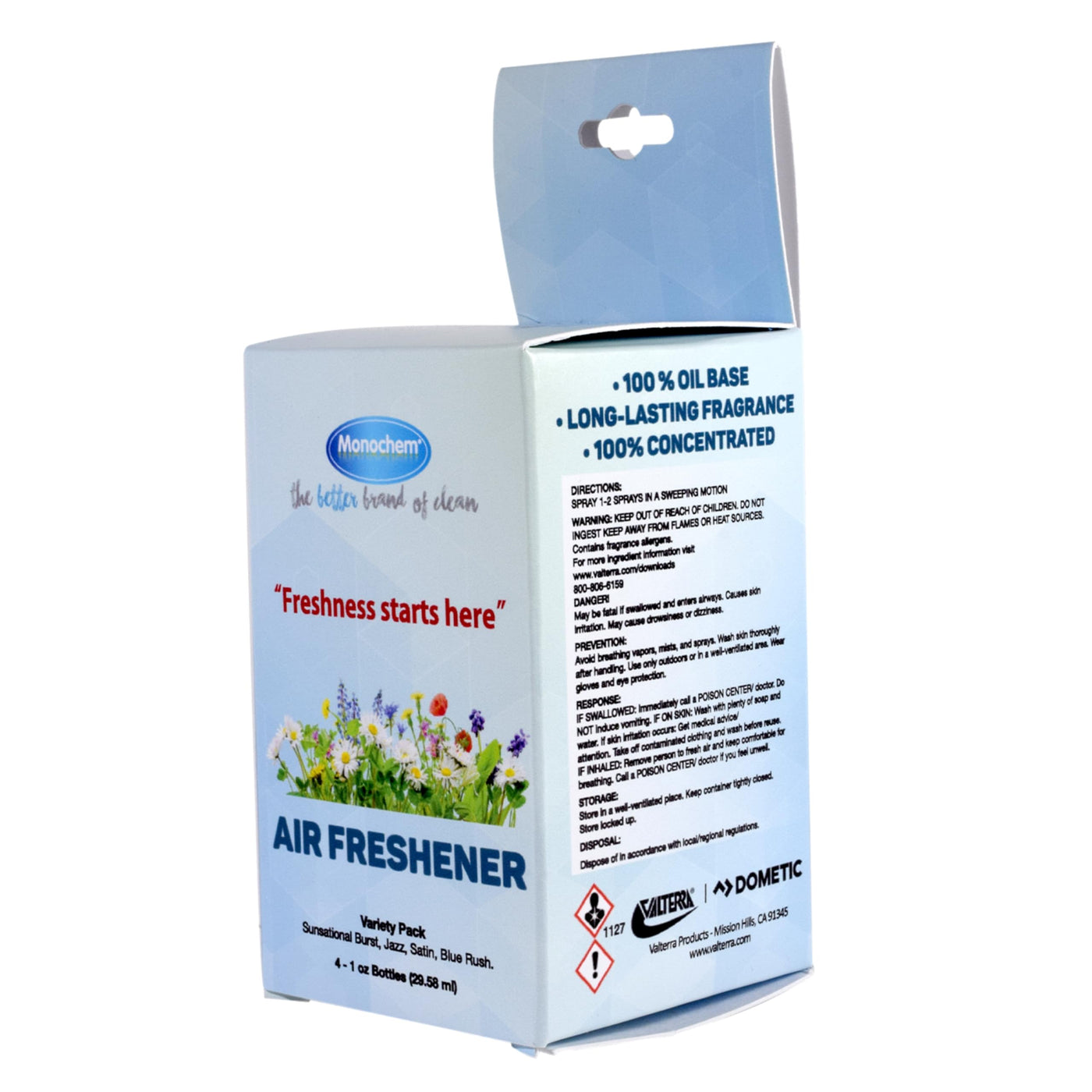 Q: What are the available scents for the Valterra VM30713 Monochem Air Freshener?A: The Valterra VM30713 Monochem Air Freshener comes in four delightful fragrances: Satin, Jazz, Blue Rush, and Sunsational Burst, allowing you to choose the perfect scent for any environment.