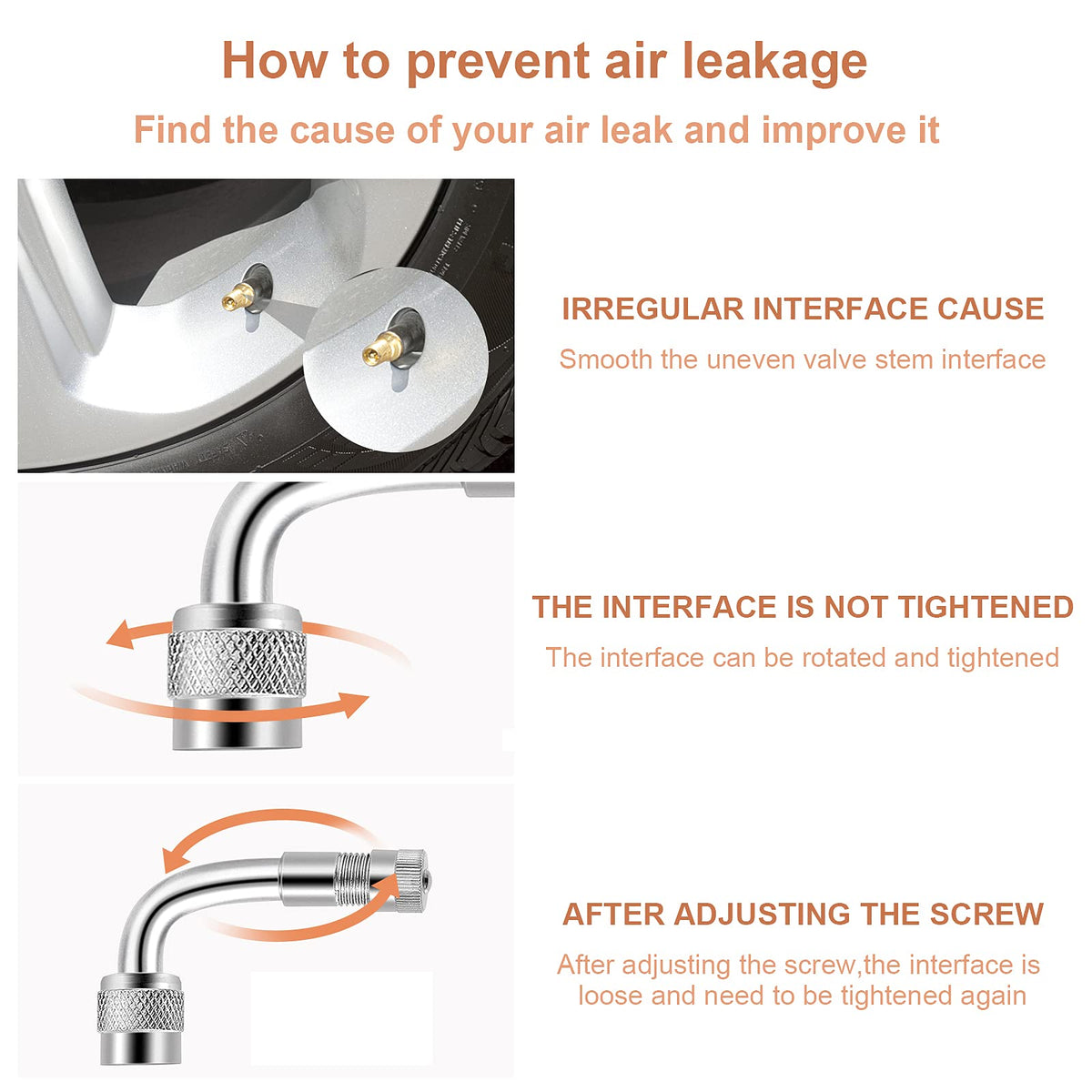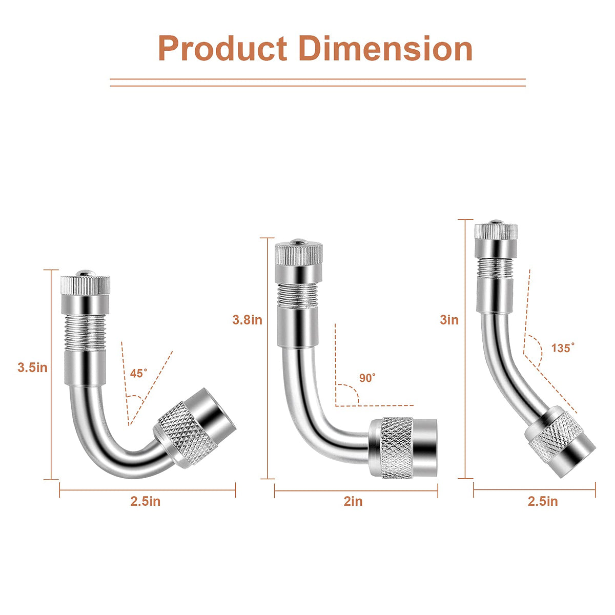 ?4Pcs 180mm Valve Stem Extenders?:Feature: Material:304 stainless steel Length: approx.180 mm. Reliable and durable:Made of copper nut and stainless steel braided flexible hose with an Heavey duty alloy clip to fix the adapter. Universal Type: Work With Tire Valve Directly, Have A Clamp / Fastener To Work Directly with Dual Wheel. Easy Work. Fits standard valve cap treads. Fit for trucks, RVs, campers, trailers, or other heavy vehiclesHelp you make sure inner tire on dually were aired up properly Included:4Pcs 7Inch Stainless Steel Tire Tyre Valve Extension Adaptors,2 pieces of 45 degree extenders, 2 pieces of 90 degree extenders and 2 pieces of 135 degree extenders, 1x Valve Core Remover,enough for yours checking and inflating works.?6 Pieces 45 90 135 Degree Brass Valve Stem Extensions?Specification: Material: Brass (Surface chrome plated) Valve Type: Schrader valve / USA valve 45 Degree Length: Approx. 3.5cm / 1.4inch 90 Degree Length: Approx. 4cm / 1.6inch 135 Degree Length: Approx. 5.5cm / 2.2inch Color: Silver Package Includes: 2 Pieces 45 Degree Tyre Valve Extension Adaptor 2 Pieces 90 Degree Tyre Valve Extension Adaptor 2 Pieces 135 Degree Tyre Valve Extension Adaptor ?EASY INSTALL&SAFETY?Simple to install, no tools required, The built-in core allows inflation and deflation. Just screw on, the stem fitting rotates on the extension shaft allowing you to set at any position and locks to your desired position and seals when finger tight. ?WIDE USAGE ?This universal extension will fit all passenger cars, light and heavy trucks,motorcycles,Trailers,Scooter,RV and recreational vehicles with standard tire valves or other heavy dualies wheel vehicles, etc.