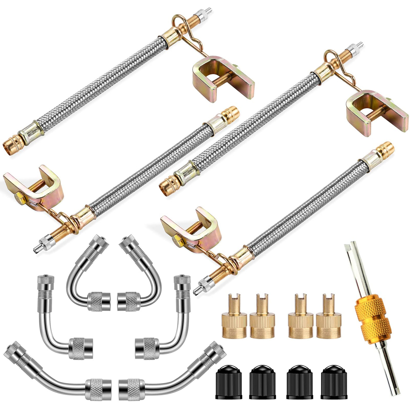Q: What is included in the Valve Stem Extender package?A: The package includes 4 pieces of 7-inch stainless steel tire valve extensions, along with 2 pieces each of 45-degree, 90-degree, and 135-degree brass valve adaptors, as well as a valve core remover, providing everything needed for tire pressure checks and inflation.