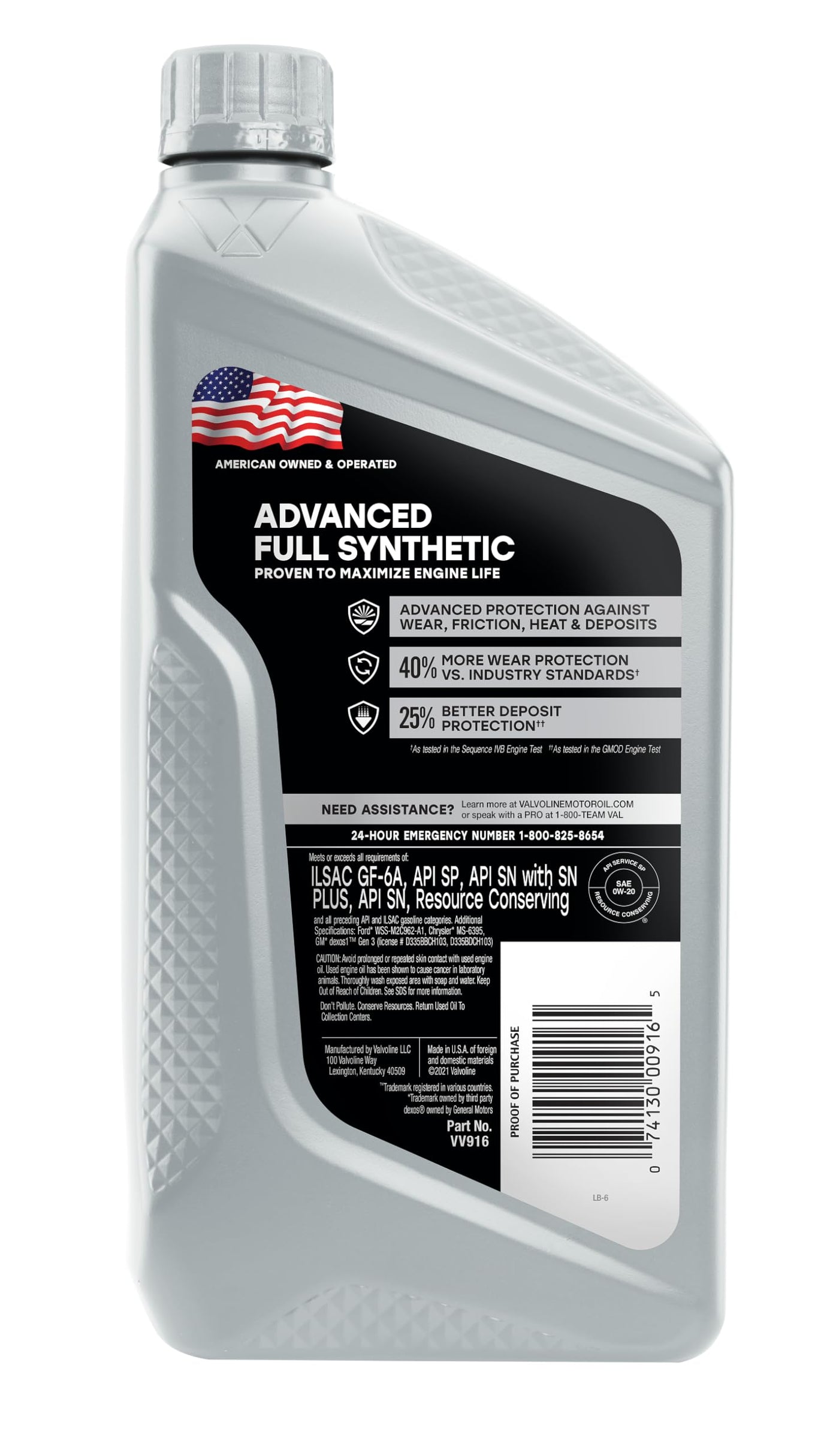 Product DescriptionAnything a conventional motor oil can do Valvoline Advanced Full Synthetic can do better. Designed with the highest quality base oils and additives, it delivers 25% better deposit protection and 40% better protection against wear than industry standards. With less wear, you can expect stronger performance, optimal fuel efficiency, and a longer-lasting engine. Driving conditions like short trips or stop-and-go traffic are hard on a vehicle and the car’s engine oil, causing extreme heat and temperature fluctuations inside your motor that can lead to harmful sludge and extra friction. Valvoline Advanced Full Synthetic Motor Oil includes additional boosters to minimize the effects of heat. And for enhanced cold start protection, it flows easily at low temperatures. Step up to one of our best motor oils for superior performance in all types of weather and conditions. GM dexos 1 Gen3 certified and approved in SAE 0W-20 and 5W-30, Valvoline Advanced Full Synthetic Motor Oil provides 24X stronger protection against engine-killing contaminants than the leading full synthetic, keeping your motor running smooth whether it’s a Ford, Toyota, Dodge, Jeep or Honda. Valvoline Advanced Full Synthetic, from the Original Motor Oil brand trusted for more than 150 years.Amazon.comMotor oil is made from crude oil and is used to lubricate, clean, and cool engines. Types of motor oil include conventional, synthetic, diesel, bio-based, hybrid (blends of conventional and synthetic), and recycled oils. Motor oil varies in weight and viscosity, as well as additives that some manufacturers add to the oil during the refining process. A numerical code system created by the Society of Automotive Engineers (SAE) grades motor oils according to viscosity--the higher the number between 0 and 60, the more viscous (thicker) the oil is. Most consumer motor oils are graded by two numbers, with the first number indicating cold weather (Winter or W) performance. SAE 0W-20This oil has a weight of SAE 0W-20, meaning it has an SAE viscosity rating of 0 in cold temperatures and a rating of 20 at normal operating temperature. Always check your vehicle's owner's manual to verify that this is the correct weight of motor oil for your vehicle. Full Synthetic OilThis oil is a full synthetic oil, meaning crude oil is not used in making it. Synthetic oil can be used in vehicle engines instead of motor oils refined from crude oil, and often provides superior mechanical performance over traditional motor oil, including increased gas mileage and reduced engine wear at extreme temperatures. Its complex method of production means it can often cost more than conventional motor oil.