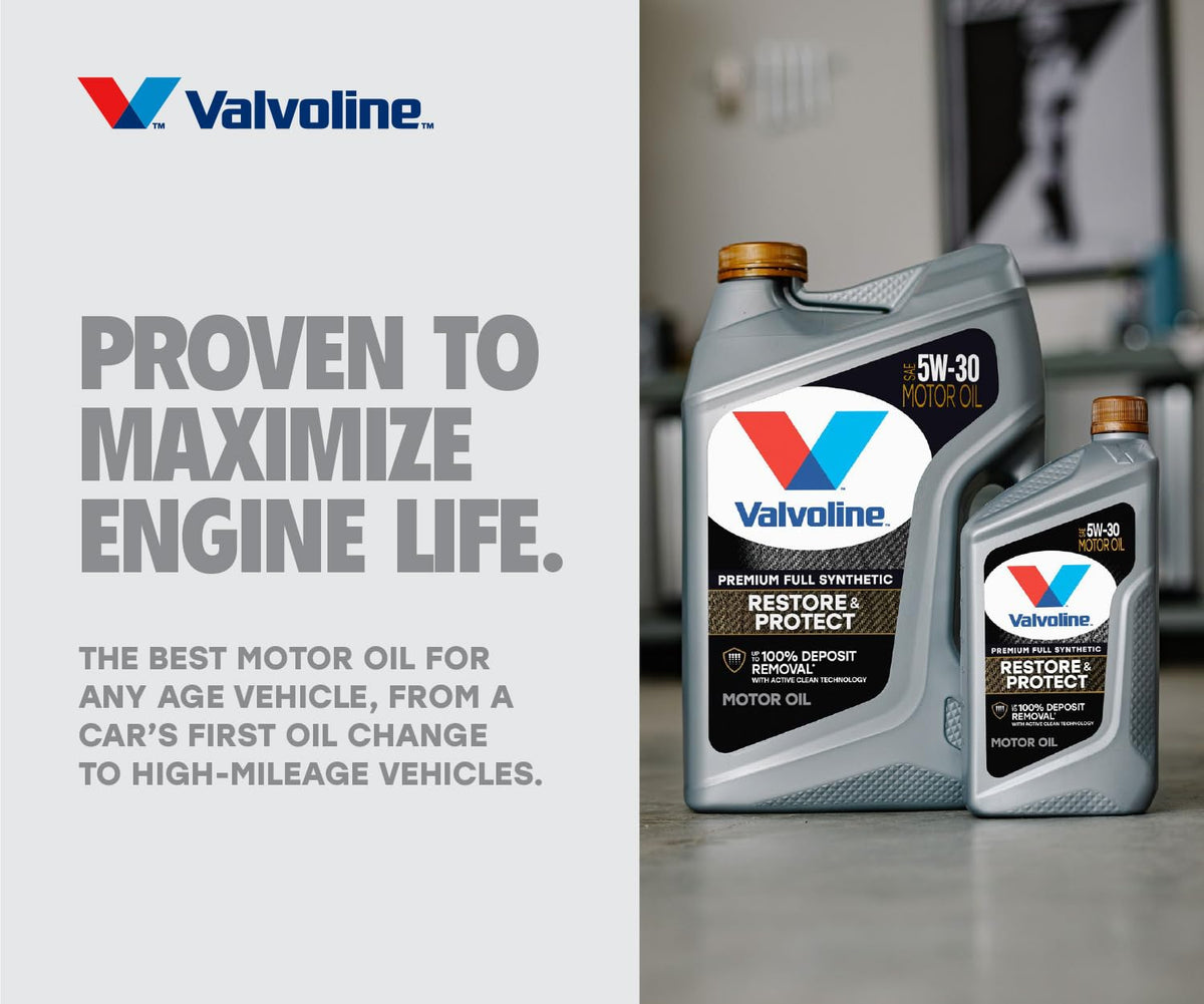 New Restore & Protect Premium Full Synthetic Is The Biggest Breakthrough In Motor Oil Since Valvoline Introduced It 150 Years Ago. With Continuous Use, Valvolines Proprietary Active Clean Technology Removes Up To 100% Of Deposits, While Its Exclusive Liqui-Shield Technology Works To Prevent Future Deposit Formation. A Clean Engine Minimizes Friction Between Metal Surfaces, Helping To Improve Fuel Economy. Valvoline Restore & Protect Is The Best Motor Oil For Any Age Vehicle, From A New Cars First Oil Change To High-Mileage Vehicles. Theres No Other Motor Oil Like It. Valvoline Restore And Protect Premium Full Synthetic Helps Maximize Fuel Economy, Horsepower, And Engine Life. We Made It First, So You Can Keep Your Pistons Factory Clean. Renew. Restore. Repeat. (*With Regular Oil Changes. In Adapted Sequence Iiih Testing: Piston Deposit Removal) The Best Motor Oil For Any Age Vehicle, From Your New Cars First Oil Change To High-Mileage Vehicles.