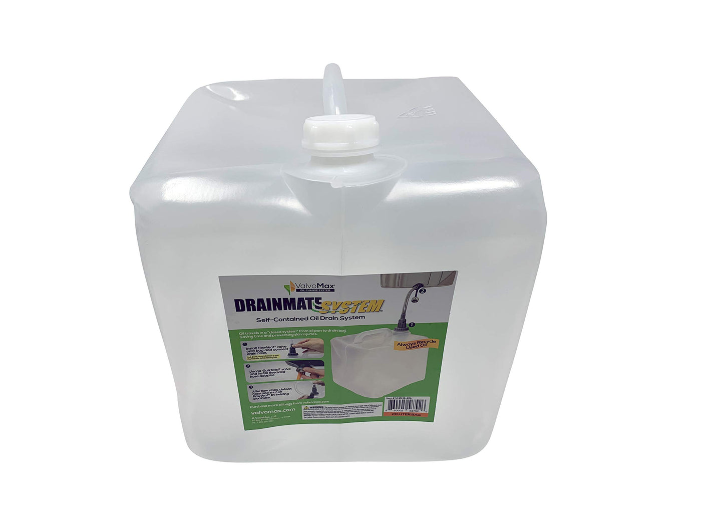 No More Cleaning Dirty Oil Pans! The Clear Oil Drain Bag Holds Up To 20L Of Used Motor Oil Upon Draining From The Vehicle. Ultra Convenient And Portable. Designed For Use With The Valvomax Oil Drain Valve. Accepted For Recycling At Most Auto Retail Stores. Quick Twist Oil Drain Valve And Flowvent Bag Attachment Are Sold Separately.