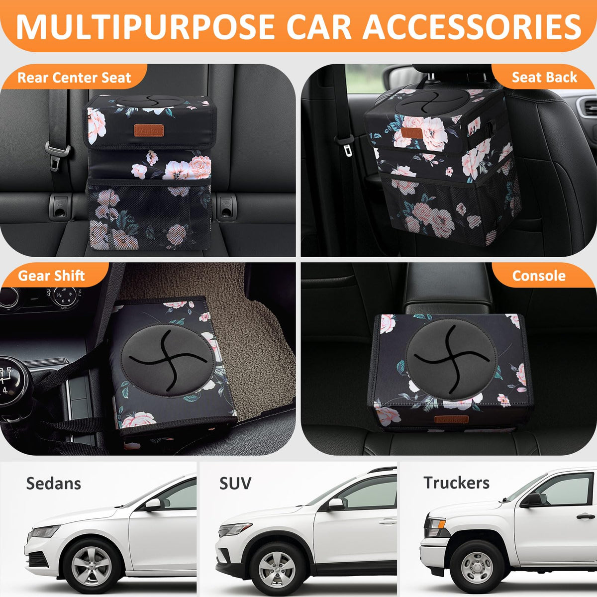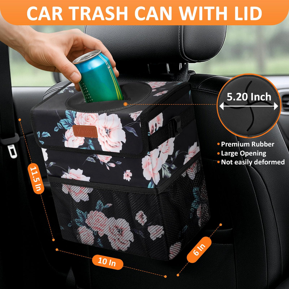 Vankor 3 Gallons Car Trash Can With Lid, Car Bag Bin Hanging Waterproof Automotive Garbage Cans Leak Proof Vehicle Trash Can Bla