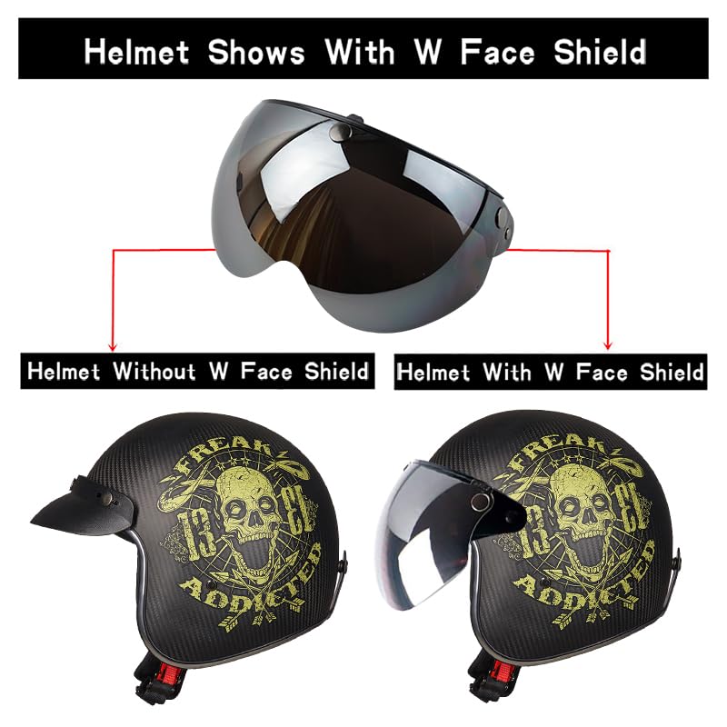 Brand New, injection-molded polycarbonate shield, meets all legal and safety requirements, shield replacement without tools in a few seconds. <br/> Universal flip up visor with integrated peak for open face helmets,Universal 3-Snap fitment, fits all open face helmets with the 3 stud configuration. <br/> The visor is suitable for ladies or men and the shield has Anti-UV, Anti-scratch treatment. <br/> Style: Retro Pilot style design, which is able to cover your forehead and eyes against strong wind and sunlight. <br/> Package includes:1x High Quality Flip Up Pilot-Style 3-Snap Visor(Wind Shield)