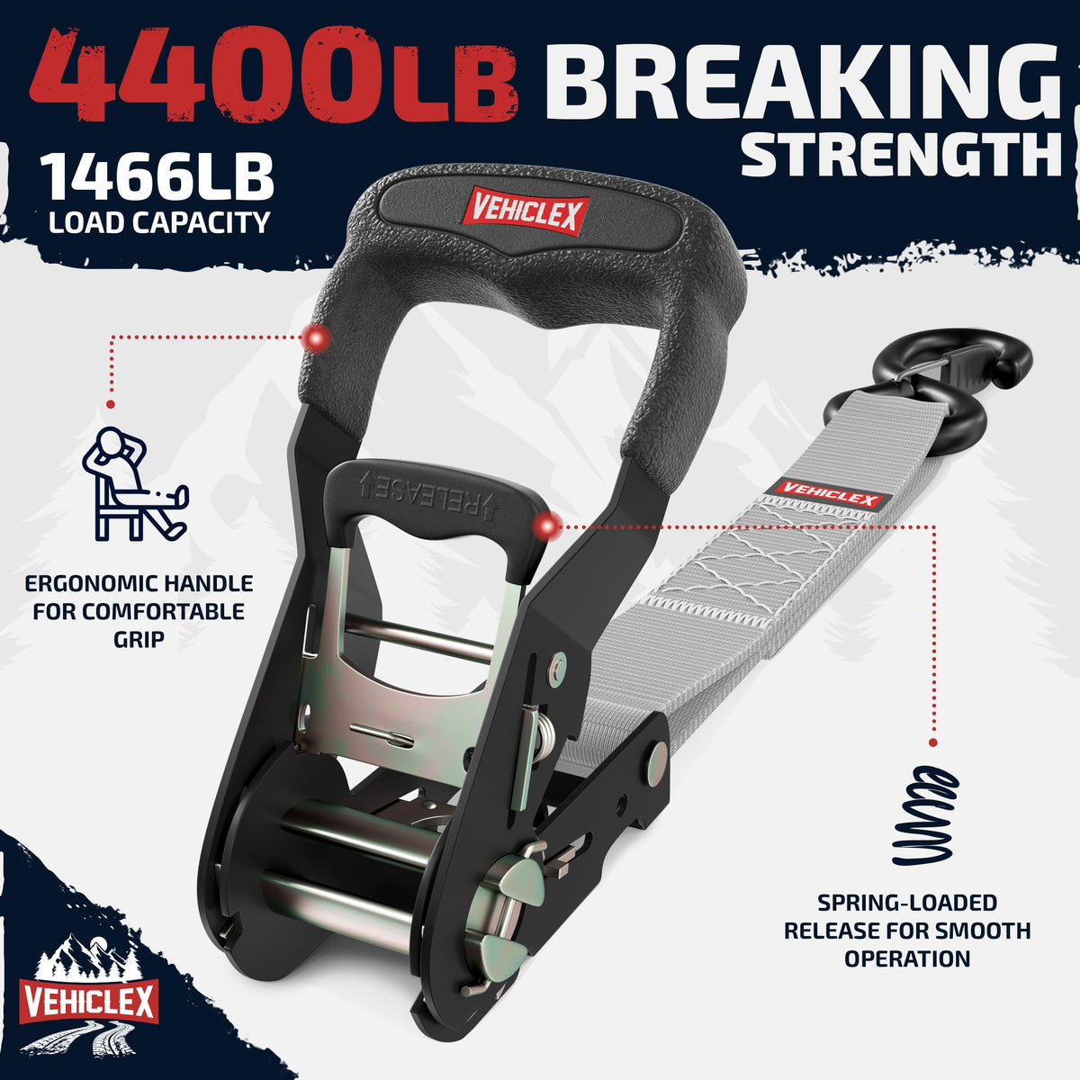 4 ratchet straps, working length - 8 ft4 soft loops - 18 inches long4400 lb break strength 100% polyester strap Reinforced stitch pattern Lockable release mechanism Full-bend closed S-hook with a clip Weather-resistant A safe solution - offering you peace of mind when securing your heavy loads. Our cargo straps for trucks have been thoroughly tested on the road to ensure reliable control over your loads. We have designed a safer and more efficient alternative to cheap ratcheting straps and other methods of securing cargo. With our heavy-duty multipurpose Vehiclex ratchet tie-down straps, you can confidently secure both small and large cargo or equipment during transport, even on rough and bumpy roads. The pack includes 4 soft loop straps and a sturdy bag for neat storage. The soft loops tie-down straps scratches and damage to vehicle frames caused by the strap hook end. HEAVY DUTY CONSTRUCTION The webbing diamond stitch pattern is reinforced with extra zigzag stitching. This boosts joint strength compared to other straps that have simpler stitching patterns. It also provides an additional safety margin to handle any extra forces and strains on the strap. The webbing is made from thick, high-tenacity polyester, ensuring it's strong and minimizes stretching. As a result, the tie-down remains durable and reliable whenever you need it. The ratchet features a comfortable rubberized handle, making it easy on your fingers. It also has a lockable spring-loaded release mechanism, which prevents accidental opening. The full-bend closed S-hook keeps it from slipping off the anchor point. Vinyl-coated hooks are highly durable and won't rust or mar painted surfaces. INTENDED USE They can be used with: ATV, UTV, RTV, Dirt Bike, Quad, Motorcycle, Scooter, Jet Ski Motorcycle Hauler, Cargo Hitch Mount