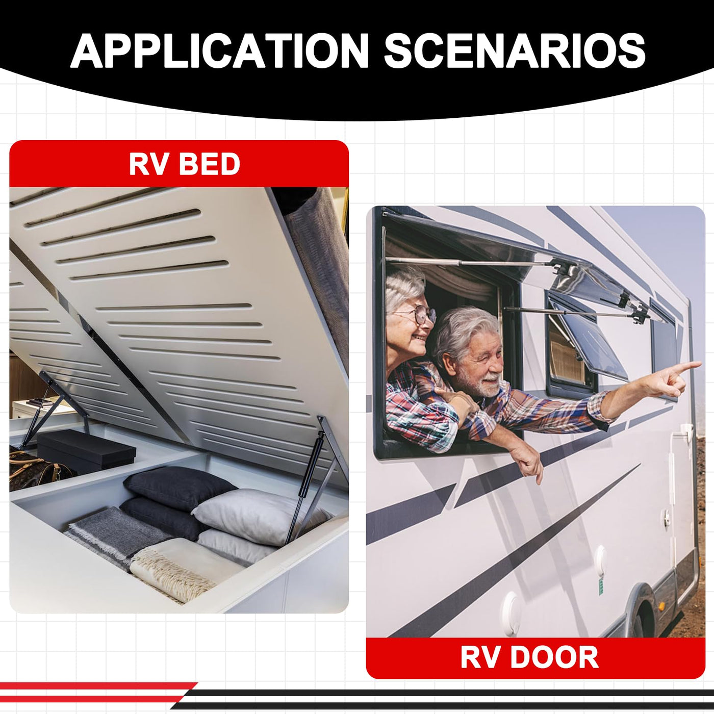 Detailed Parameters: Extended length : 19.69 inch (500mm), compressed length: 11.62 inch (295mm); Force 10lb (44N) Per Strut,End hole diameter: 10mm. Mounting hardware is not included in the package. Do measure the lid weight or check the oem number before purchase | Interchange Number: 125719R, 7574QT, FS125719R, FS-125719R, ML1410, ML14-10, ML-14-10, SX200P10.You can measure the lid weight or check the oem number to buy correct items | Applications: The gas shocks 20 inch can be used as RV bed, RV compartment door, RV mattress, heavy lid, truck bed tonneau cover, camper bed door, tanning bed, travel trailer compartment doors, truck bed cover etc, can be used in a variety of scenarios | Strong Enough and Easy to Install: Installing the gas strut is a breeze, requiring only a flat head screwdriver, the struts remains in excellent condition even in harsh environments. They are impossible to compress by hand, ensuring long-lasting performance | 12+4 Month Product Service: Welcome to click ''ask seller'' beside your order for in-time assistance if any need