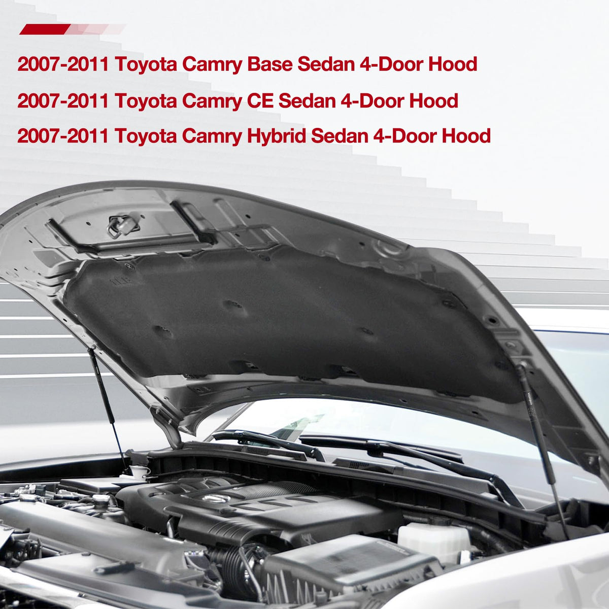 Fits the following applications: 2007-2011 Toyota Camry Base Sedan 4-Door Hood 2007-2011 Toyota Camry CE Sedan 4-Door Hood 2007-2011 Toyota Camry Hybrid Sedan 4-Door Hood 2007-2011 Toyota Camry LE Sedan 4-Door Hood 2007-2011 Toyota Camry SE Sedan 4-Door Hood 2007-2011 Toyota Camry XLE Sedan 4-Door Hood