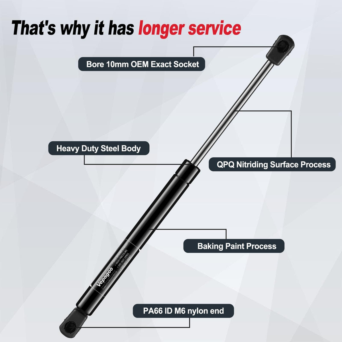 The Vepagoo lift supports are crafted from stainless steel, ensuring long-lasting durability and resistance against wear and tear. The sleek black color adds a touch of sophistication while seamlessly blending with your vehicle's interior.