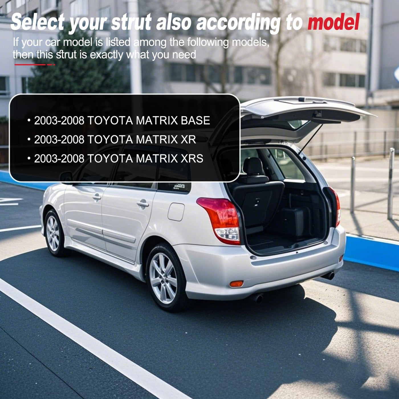 Fits the following applications: 2003-2008 Toyota Matrix Base Wagon 4-Door Tailgate 2003-2008 Toyota Matrix XR Wagon 4-Door Tailgate 2003-2008 Toyota Matrix XRS Wagon 4-Door Tailgate