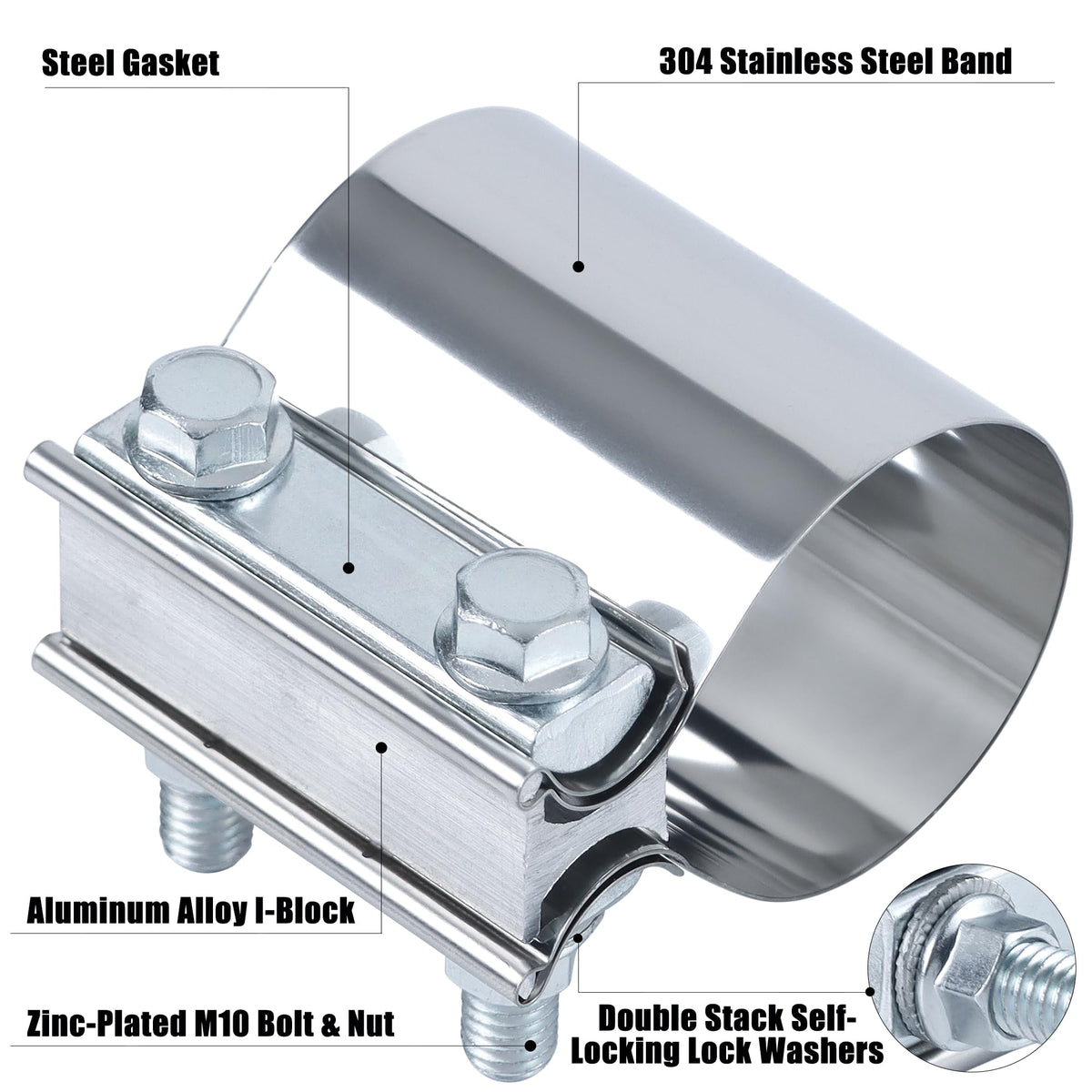 Vitonsbay 2.25 Inch Exhaust Clamp, 2 1/4 Inch Butt Joint Exhaust Pipe Muffler Band Clamp Sleeve Coupler Stainless Steel(2Pcs)