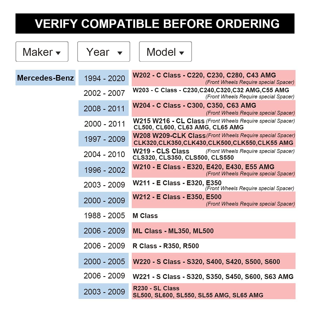Q: What vehicles are compatible with VLAOSCHI Black 5x112 Hubcentric Wheel Spacers?A: The VLAOSCHI Black 5x112 Hubcentric Wheel Spacers are compatible with a variety of vehicles, including the Mercedes-Benz, BMW, and Audi models with a 5x112 bolt pattern. This includes cars like the 2009-2019 A4/S4, A5/S5, A6/S6, A7/S7, A8/S8, as well as various C, E, and S-Class models from 1994 to 2020.