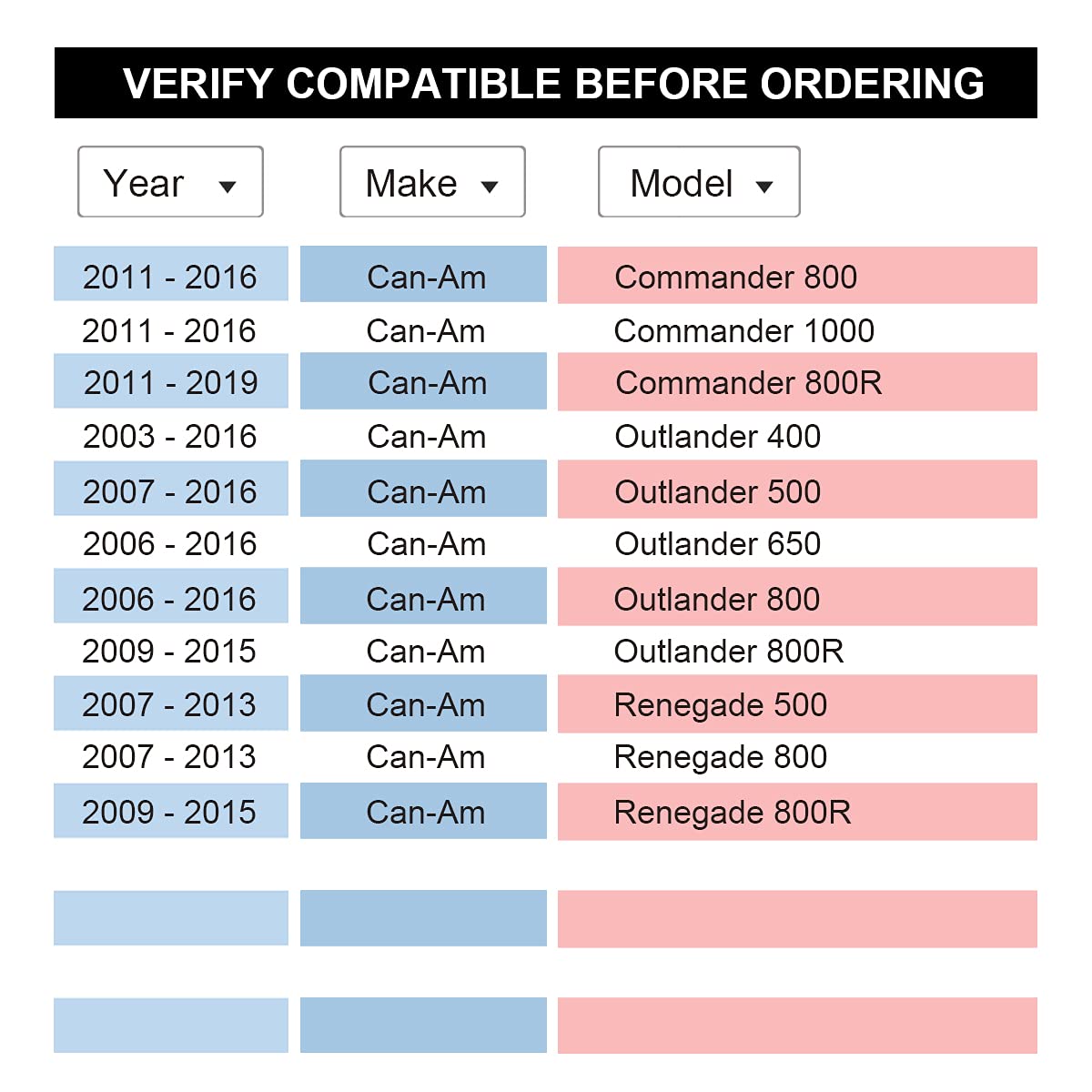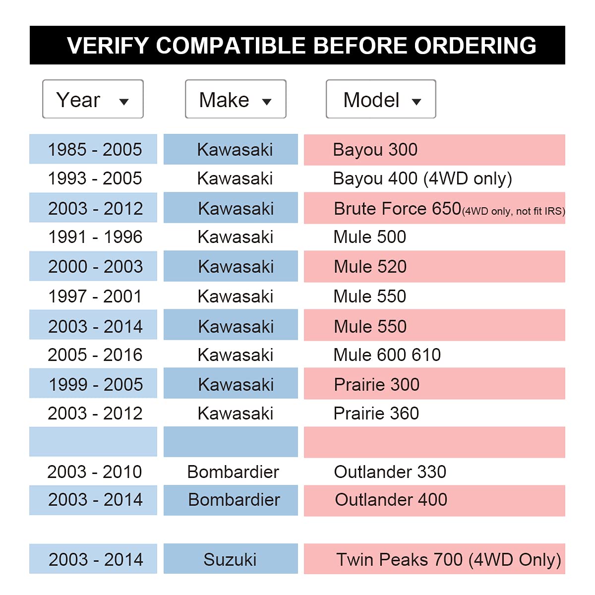 *If you don't make sure whether this item fits to you, message us with your vehicle year, maker and model, we will find the item you need.Compatible with Kawasaki 1985-2005 Bayou 3001993-2005 Bayou 400 (4WD only)2003-2012 Brute Force 650(4WD Only, not Fit IRS)1991-1996 Mule 5002000-2003 Mule 5201997-2001 Mule 5502003-2014 Mule 5502005-2016 Mule 600 6101999-2005 Prairie 3002003-2012 Prairie 360 Compatible with Can-Am 2011-2016 Commander 800 10002011-2019 Commander 800R2003-2016 Outlander 4002007-2016 Outlander 5002006-2016 Outlander 6502006-2016 Outlander 8002009-2015 Outlander 800R2007-2013 Renegade 500 8002009-2015 Renegade 800R Compatible with Bombardier2003-2010 Outlander 3302003-2014 Outlander 400Compatible with Suzuki2004-2006 Twin Peaks 700 (4WD Only) Important! Please verify the bolt count, bolt circle diameter, center bore, and bolt size match your vehicle before ordering.We recommend getting this kit installed by a trained professional, but it is not necessary.We don't recommend to install the bolt nuts by electronic tool, it is best by manual.