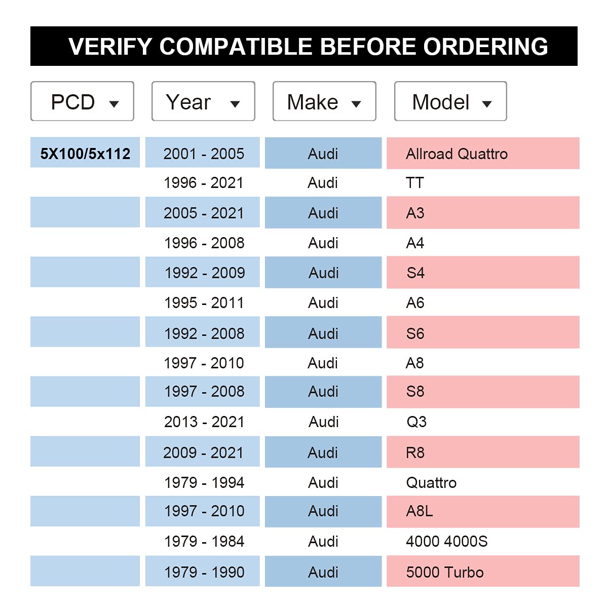 *If you don't make sure whether this item fits to you, message us with your vehicle year, maker and model, we will find the item you need.Compatible with Audi2001-2005 Allroad Quattro1996-2024 TT2005-2024 A31996-2008 A41992-2009 S41995-2011 A61992-2008 S61997-2010 A81997-2008 S82013-2024 Q32009-2024 R8Compatible with Volkswagen1992-1994 Corrado1992-1998 Golf (5 Lug Only)1999-2021 Golf1999-2024 GTI2004-2009 R321992-1998 Je-tta (5 Lug Only)1998-2024 Je-tta1998-2024 Bee-tle2007-2016 EOS2009-2024 T-i-g-u-a-n (Not V6 V8 TDI SPORT HYBRID)2009-2017 CC1990-1997 Pa-ssat(5 Lug Only)1998-2024 Pa-ssatImportant! Please verify the bolt count, bolt circle diameter, center bore, and bolt size match your vehicle before ordering.We recommend getting this kit installed by a trained professional, but it is not necessary.We don't recommend to install the bolt nuts by electronic tool, it is best by manual.