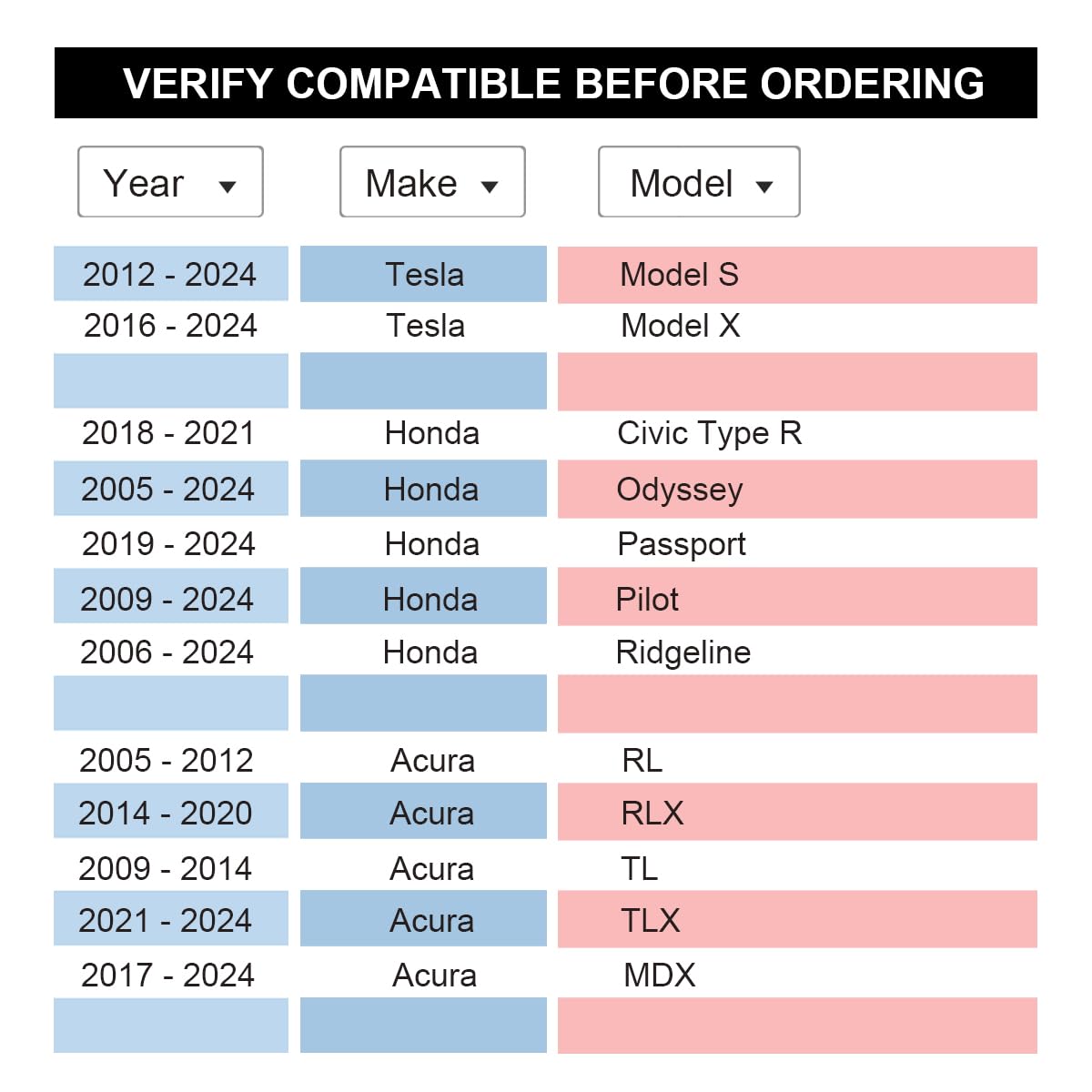 *If you don't make sure whether this item fits to you, message us with your vehicle year, maker and model, we will find the item you need.Compatible with Tesla2012-2024 Model S2016-2024 Model XCompatible with Honda2018-2021 Civic Type R2005-2024 Odyssey2019-2024 Passport2009-2024 Pilot2006-2024 RidgelineCompatible with Acura2005-2012 RL2014-2020 RLX2009-2014 TL2021-2024 TLX2017-2024 MDXImportant! Please verify the bolt count, bolt circle diameter, center bore, and bolt size match your vehicle before ordering.We recommend getting this kit installed by a trained professional, but it is not necessary.We don't recommend to install the bolt nuts by electronic tool, it is best by manual.