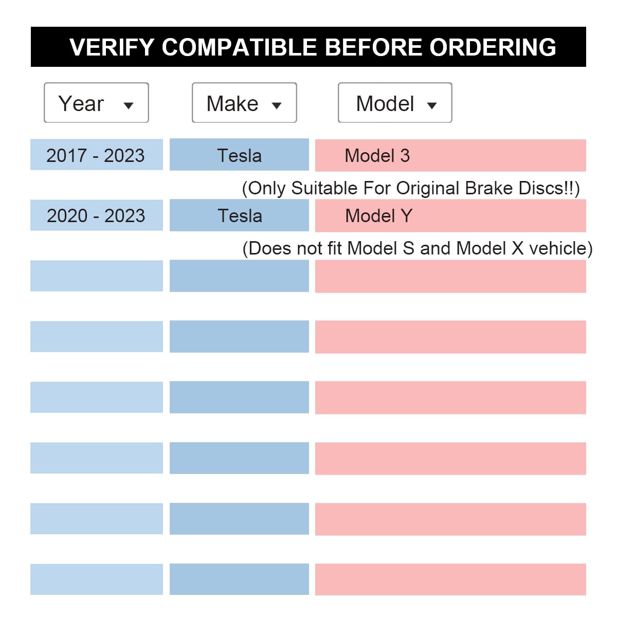 *If you don't make sure whether this item fits to you, message us with your vehicle year, maker and model, we will find the item you need.Compatible Vehicles2017-2023 Model 3 (Only Suitable For Original Brake Discs!!)2020-2023 Model YDoes not fit Model S and Model X version.Important! Please verify the bolt count, bolt circle diameter, center bore, and bolt size match your vehicle before ordering.We recommend getting this kit installed by a trained professional, but it is not necessary.We don't recommend to install the bolt nuts by electronic tool, it is best by manual.
