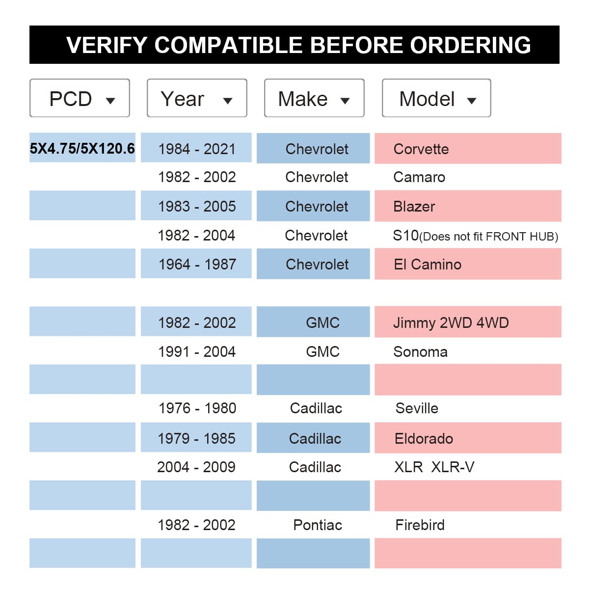 *If you don't make sure whether this item fits to you, message us with your vehicle year, maker and model, we will find the item you need.Compatible Vehicles1984-2021 Corvette1982-2002 Camaro1983-2005 Blazer1964-1987 El Camino1982-2004 S10(Does not fit FRONT HUB)1982-2002 Jimmy1991-2004 Sonoma1976-1980 Seville1979-1985 Eldorado2004-2009 XLRCompatible with Pontiac Firebird 1982-2002Important! Please verify the bolt count, bolt circle diameter, center bore, and bolt size match your vehicle before ordering.We recommend getting this kit installed by a trained professional, but it is not necessary.We don't recommend to install the bolt nuts by electronic tool, it is best by manual.