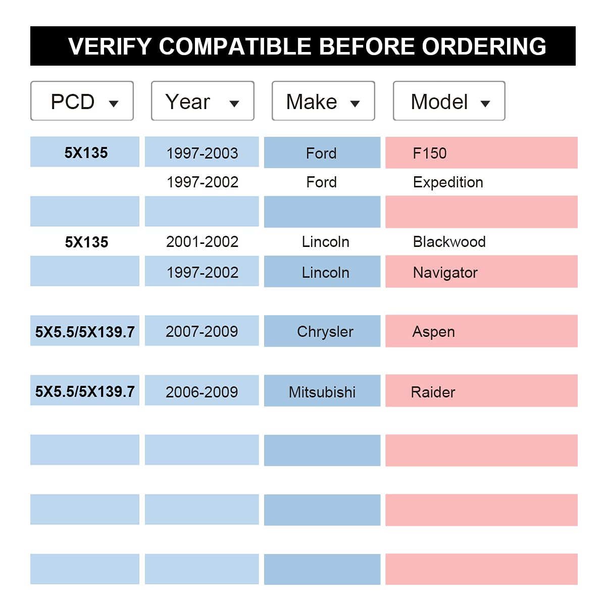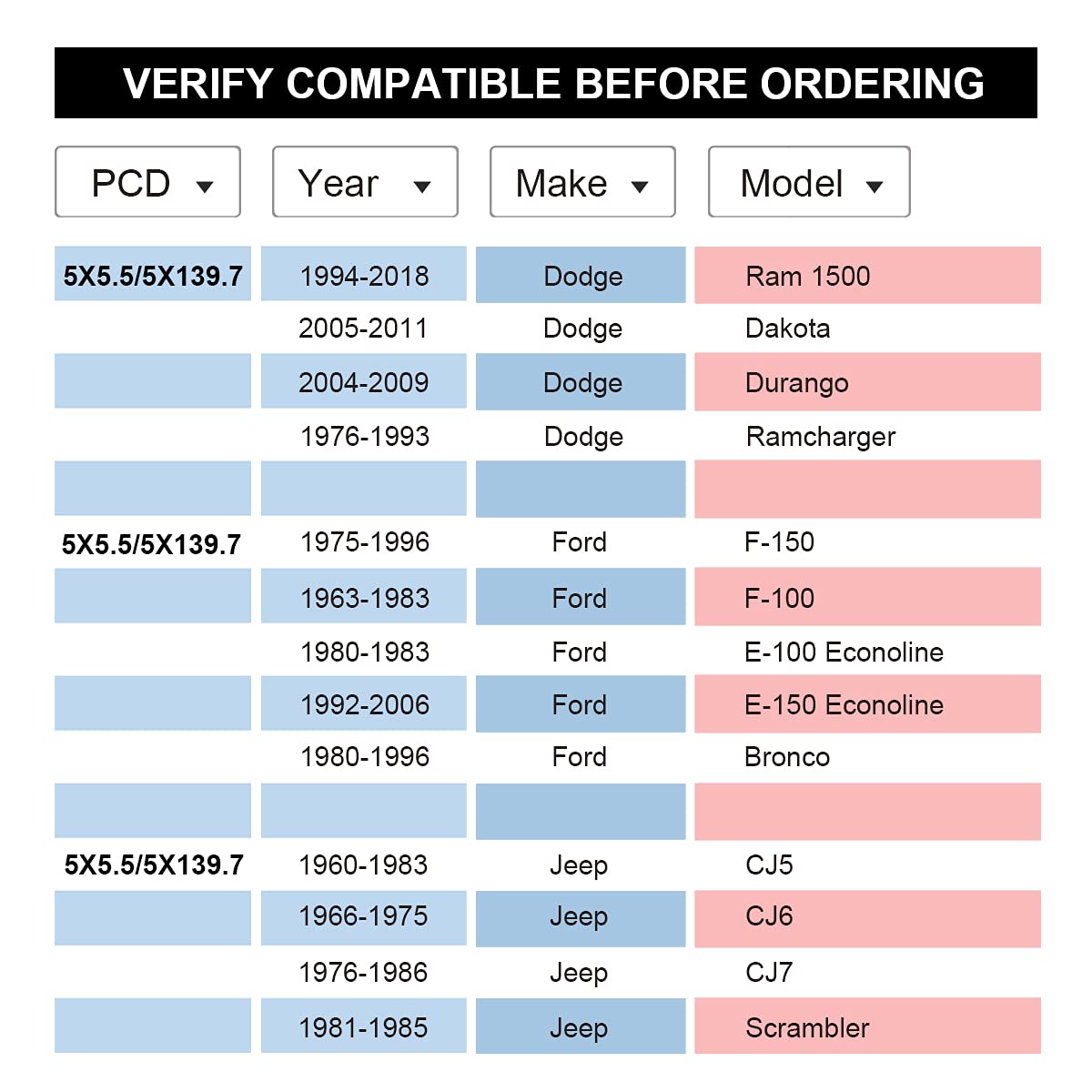 *If you don't make sure whether this item fits to you, message us with your vehicle year, maker and model, we will find the item you need.Compatible Vehicles1976-1993 Ramcharger2005-2011 Dakota2004-2009 Durango1977-1993 W150Compatible with Ram 1500 1994-2018 (DO NOT FIT 2019-2022 RAM1500)1975-2003 F150 (DO NOT FIT 2004-2021 F150)1980-1996 Bronco1997-2002 Expedition1963-1983 F1001980-1983 E100 Econoline1992-2002 E150 Econoline1997-2002 Navigator2001-2002 Blackwood1963-1966 CJ31960-1983 CJ51966-1986 CJ61976-1986 CJ71981-1985 ScramblerImportant Information Please verify the bolt count, bolt circle diameter, center bore, and bolt size match your vehicle before ordering. We don't recommend to install the bolt nuts by electronic tool, it is best by manual. No returns or exchanges once they have been installed.