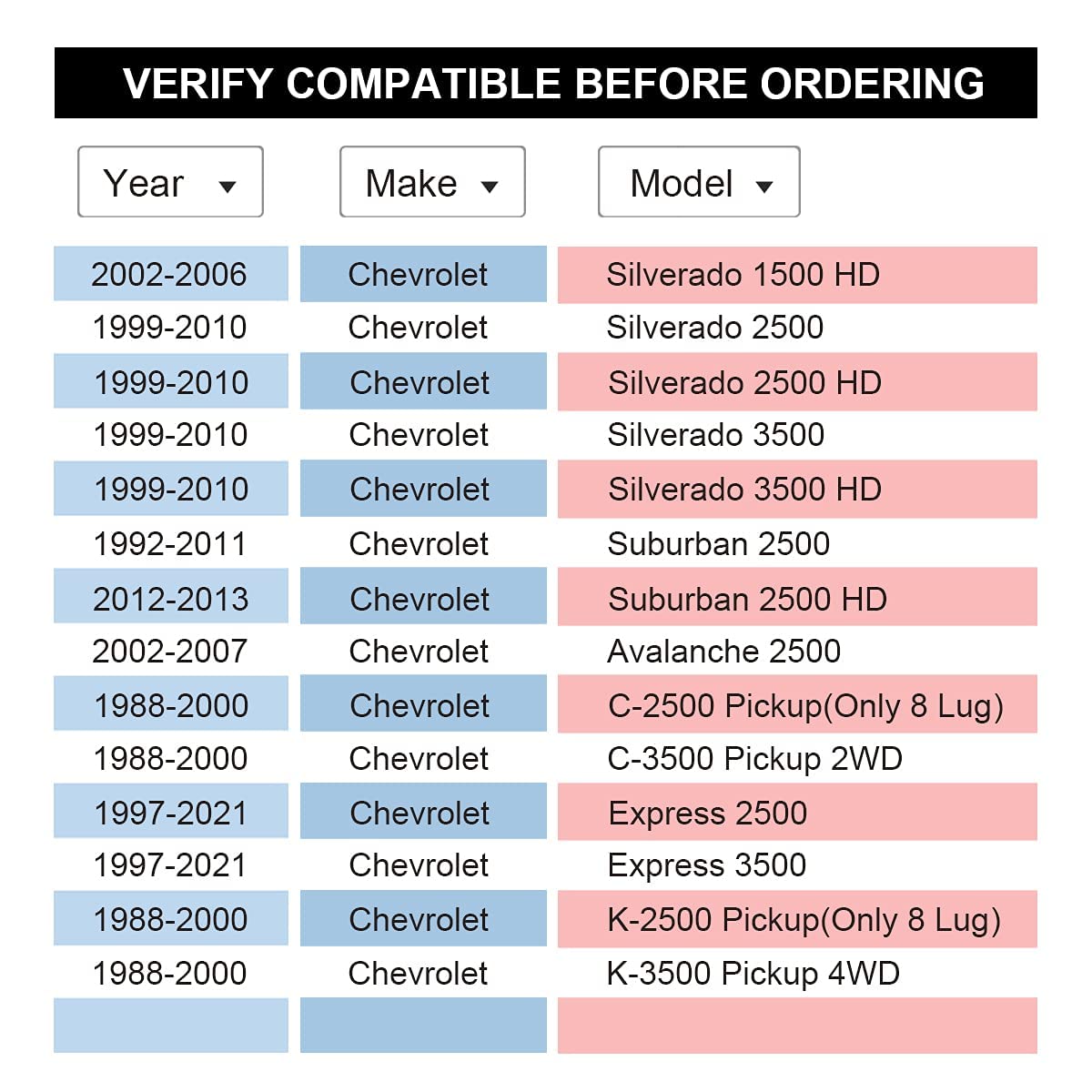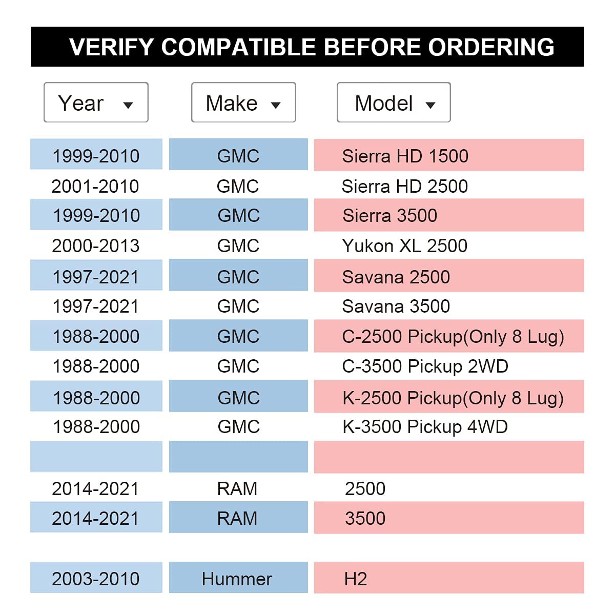*If you don't make sure whether this item fits to you, message us with your vehicle year, maker and model, we will find the item you need.Compatible Vehicles1988-2000 C2500 C3500 K2500 K3500 Pickup (Only 8 Lug) 1997-2022 Express 2500 3500 2002-2006 Silverado 1500 HD 1999-2010 Silverado 2500 1999-2010 Silverado 3500 1992-2013 Suburban 2500 2002-2007 Avalanche 2500 1997-2021 Savana 2500 3500 1999-2010 Sierra HD 1500 2500 1999-2010 Sierra 3500 2000-2013 Yukon XL 2500Compatible with Ram 2500 2014-2022Compatible with Ram 3500 2014-2022Compatible with Hummer H2 2003-2010Important! Please verify the bolt count, bolt circle diameter, center bore, and bolt size match your vehicle before ordering.We recommend getting this kit installed by a trained professional, but it is not necessary.We don't recommend to install the bolt nuts by electronic tool, it is best by manual.