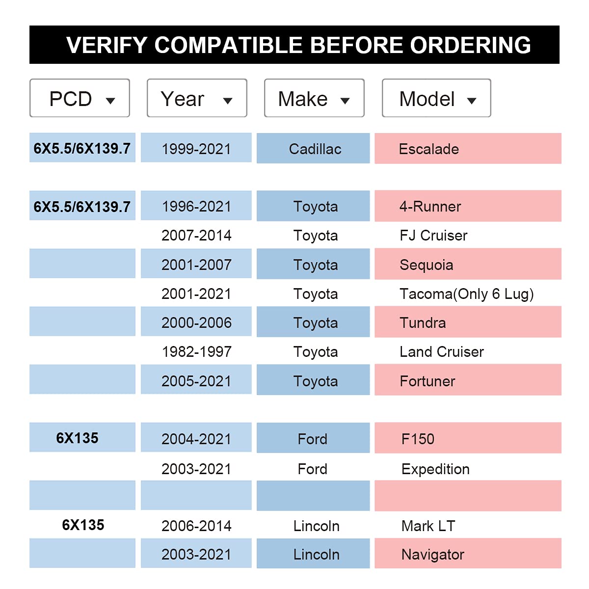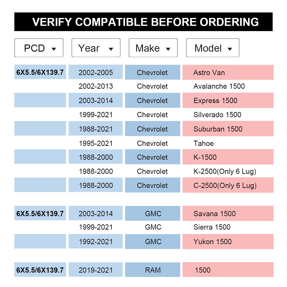 *If you don't make sure whether this item fits to you, message us with your vehicle year, maker and model, we will find the item you need.Compatible Vehicles1999-2022 Silverado 1500 2000-2022 Suburban 15001995-2022 Tahoe2003-2014 Express 15002004-2012 Colorado 1999-2022 Sierra 15002003-2014 Savana 15001992-2022 Yukon 15002004-2012 CanyonCompatible with Ford F150 2004-2022 (DO NOT FIT 1992-2003 F150)Compatible with Ford Expedition 2003-2022Compatible with Lincoln Navigator 2003-2022Compatible with Cadillac Escalade 1999-20221996-2022 4-Runner2007-2014 FJ Cruiser2001-2007 Sequoia2001-2022 Tacoma(Only 6 Lug)2000-2006 Tundra1982-1997 Land Cruiser2005-2022 FortunerCompatible with Ram 1500 2019-2022Important Information Please verify the bolt count, bolt circle diameter, center bore, and bolt size match your vehicle before ordering.This is 12mm wheel spacer, to mount the rims safely, it needs the stock studs are 12mm long extraly. If not, you need to replace them to longer ones.We don't recommend to install the bolt nuts by electronic tool, it is best by manual. No returns or exchanges once they have been installed.