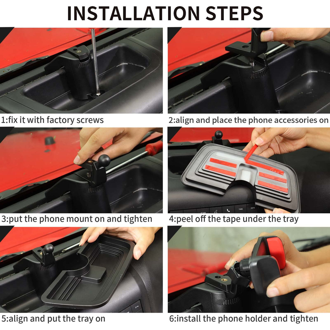 Model: for Jeep JK Phone Holder with Storage Cell Phone Central Dash Phone Mount with Storage Bin for 2011-2018Jeep Wrangler JK JKU Interior Accessories ( Sports, Sahara, Freedom & Rubicon ) - Compatible with iPhones, Androids and other smartphones. Feature: - The adjustable phone mount is a custom fit cradle that holds onto your device while hitting the trails - View and answer incoming calls quickly - Material: Excellent Quality ABS Installtion Notes - 1. Use the screw in the middle of the tray area on dash. - 2. Easily snaps into dash. After sales service - Our all products have 30 days of after-sale protection and 2 years services - If you have any suggestions or questions for our products, please Get in Touch with Us as soon as possible. Package Includ: 1x phone holder