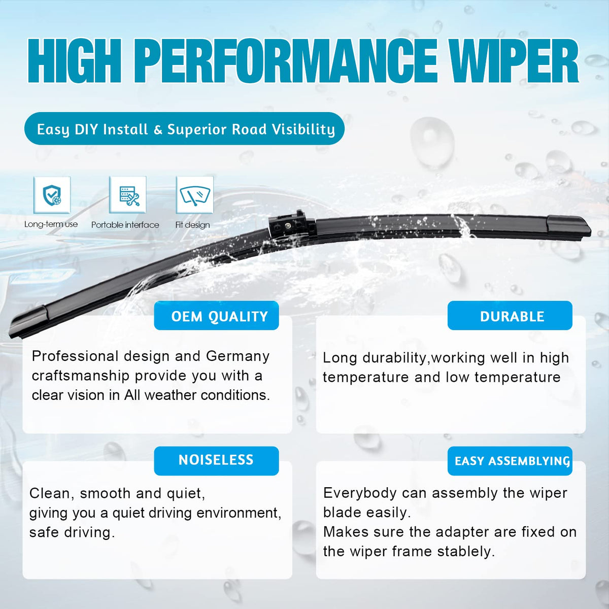 Q: What makes these wiper blades suitable for all-weather conditions?A: These wiper blades are made with high-quality materials that provide durability and smooth engagement, making them effective for all-weather and all-season use.