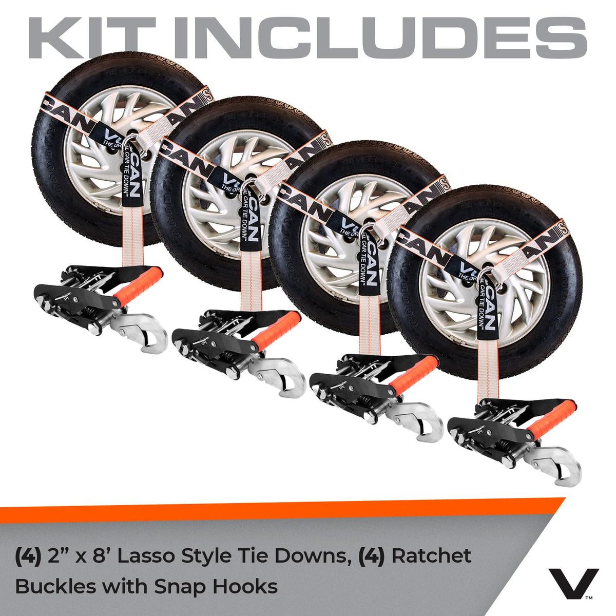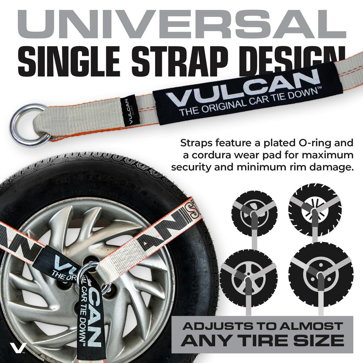 Loop Style Straps Adjust To Fit Almost Any Tire SizeProfessional operators choose Vulcan automobile tie down systems to haul millions of vehicles every yearVulcan is recognized as the most qualified, most experienced, car tie down manufacturer in the worldEasily trailer any car, truck, SUV, or sports carDesigned for use on flat bed trailers, wheel lifts and tow dolliesStraps feature a universal loop design that self-adjusts to fit most tiresThe ''lasso style'' harnesses with smooth O-rings work with flat bed trailers and many popular wheel lifts and tow dolliesThe heavy duty 2'' x 96'' Silver Series tie down webbing provides excellent durability and long service lifeEach strap has a plated O-ring and a cordura wear pad for maximum security and minimum rim damageEach strap also includes a ratchet buckle with plated snap hook for extra strength and weather resistanceThe snap hook provides a secure connection to D rings, side rails or stake pocketsSafe working load is 3300 lbs.Meets all DOT requirementsNote: Always secure any vehicle for transport by four points