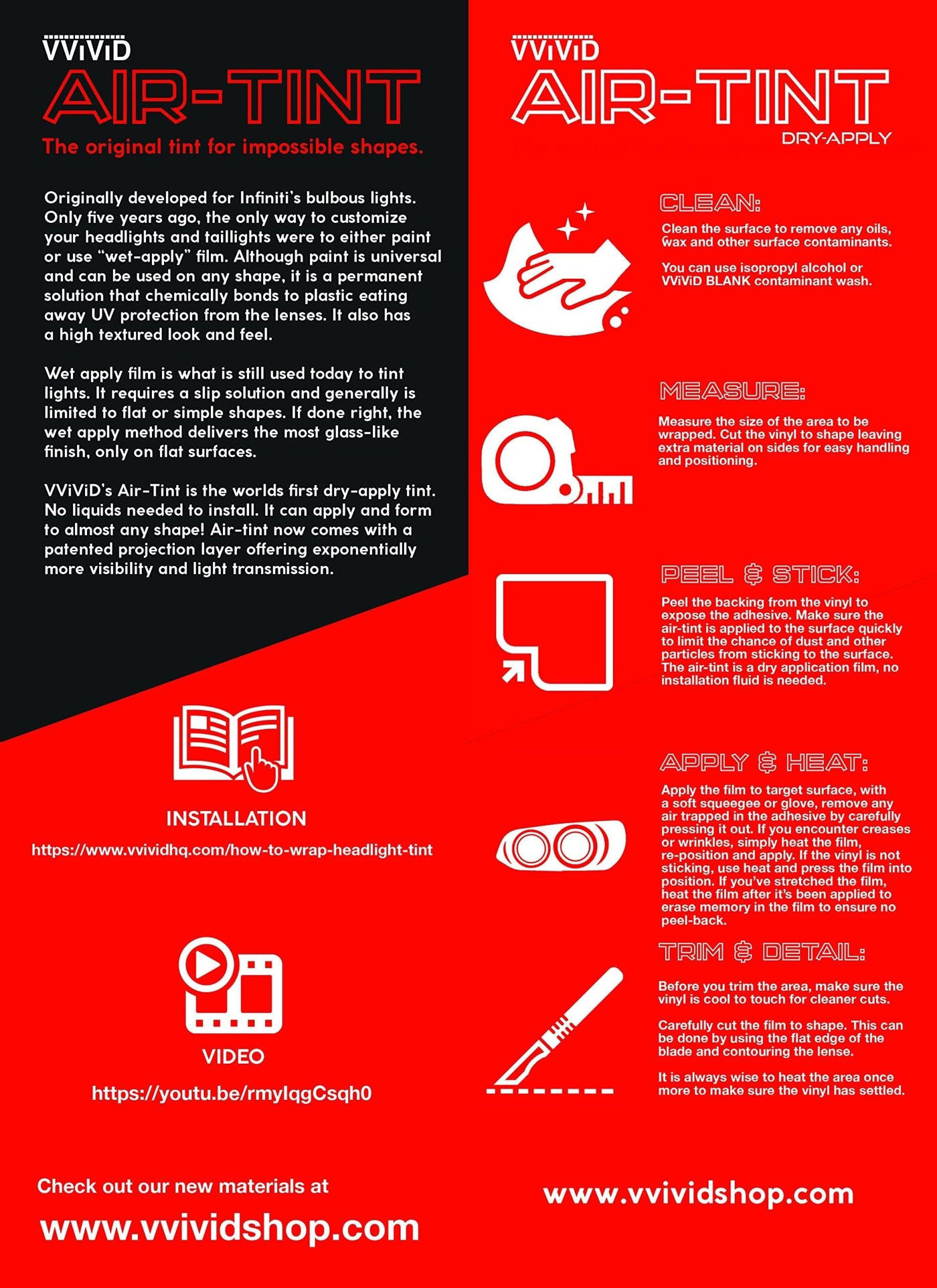 Durable and Scratch-Resistant: Made with scratch-resistant automotive grade cast vinyl, VViViD Air-Tints were developed in Canada to minimize shrinkage and peeling.