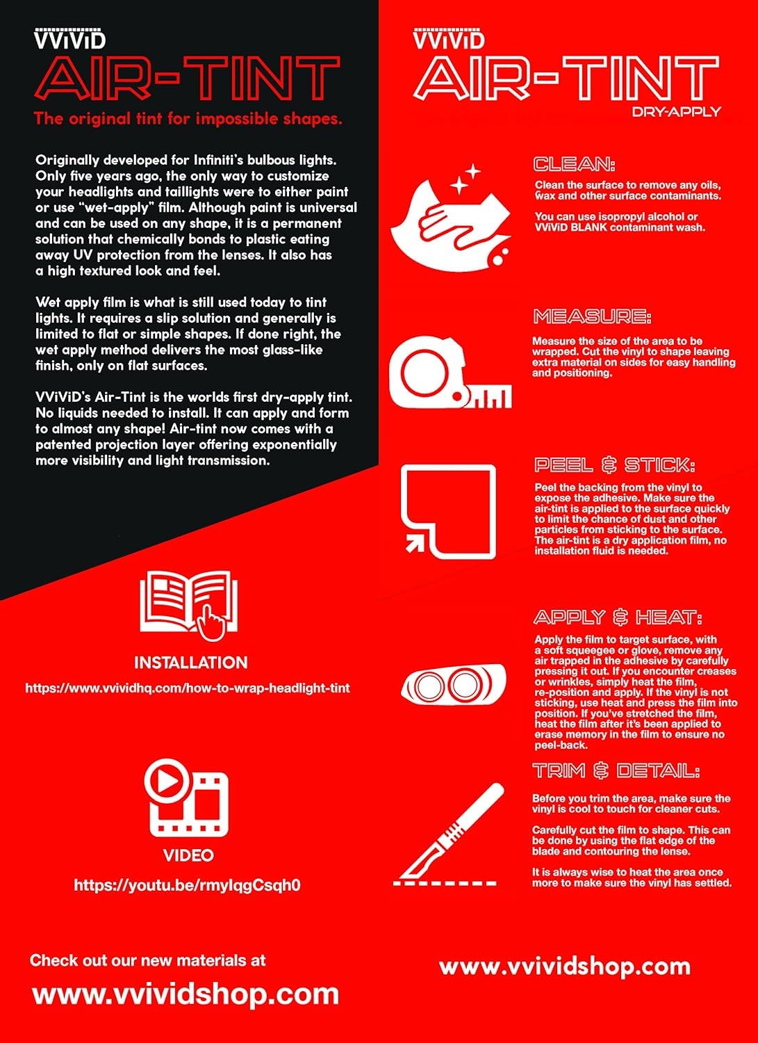 These tint films are the first of their kind and are designed to conform to any difficult surface that would otherwise be impossible with standard headlight tints. All headlight tints come with a subtle natural air release pattern and can be installed using either dry or wet application methods.