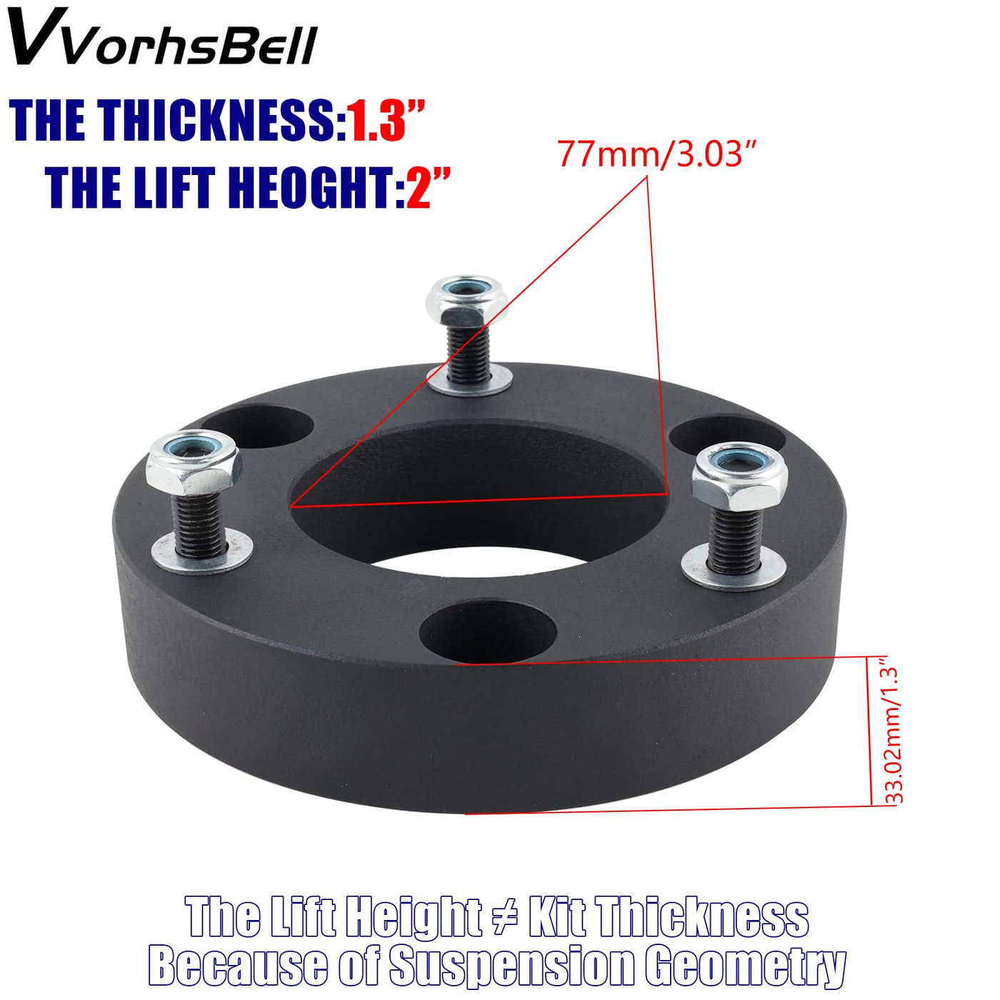 ?Lifting height?ThisLeveling lift kit will raise the front of your car by 3 inch and the rear of your car by 2 inch.Due to the geometry of the suspension,the ratio of lifting height to kit thickness is not 1:1.The actual thickness of the leveling lifting kit itself is less than the lifting height