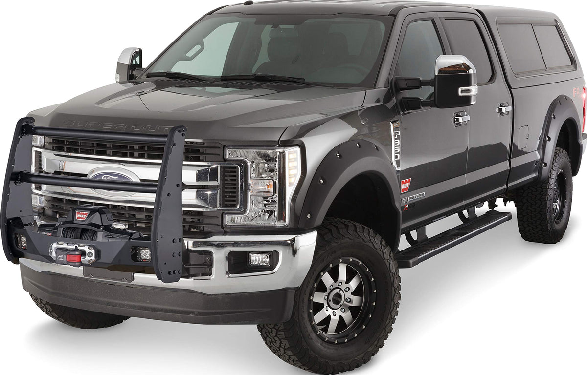 The WARN 102957 tall, bolt-on, center-only grille guard is designed for the 2017-2019 Ford Super Duty and provides rugged protection for the OE bumper, winch, and vehicle grille. It features 2 tubular cross members, one with welded tabs to mount lights, and a replaceable rubber trim that adds protection and style. The WARN 102957 grille guard requires WARN part number 103011 or 103010.