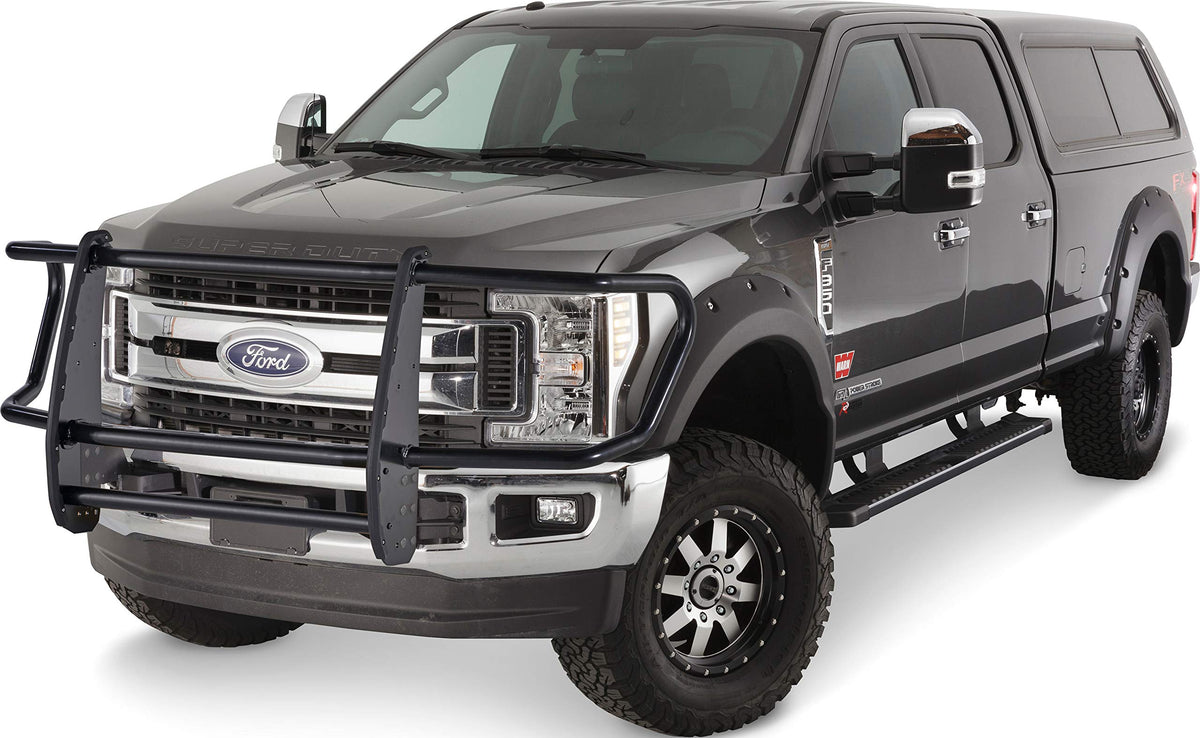 The WARN 103014 full grille guard does not have a winch mount and is designed for the 2017-2019 Ford Super Duty. There is no need to remove the factory bumper, making this grille guard quick to install. It features 2” light tubes and cross members, one with welded tabs to mount lights, and a replaceable rubber trim that adds protection and style. The WARN 103014 includes the full grille guard as well as a mounting bracket.